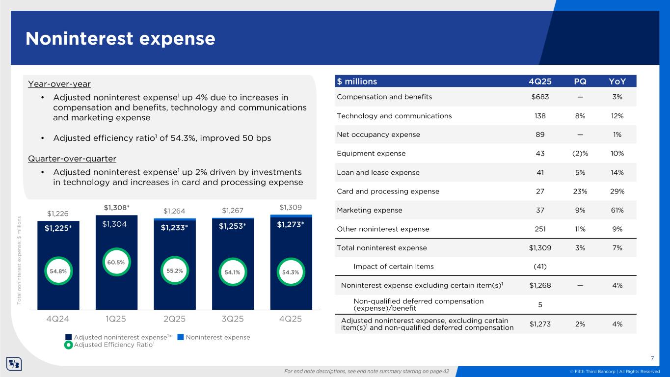 © Fifth Third Bancorp | All Rights Reserved Year-over-year • Wealth and asset management revenue up 13% driven by continued AUM growth • Commercial payments revenue up 8% aided by strong momentum in Newline and DTS Connex Quarter-over-quarter • Commercial banking revenue up 17% driven by higher lease syndication and remarketing Noninterest income T o ta l n o ni nt er es t in co m e; $ m ill io ns For end note descriptions, see end note summary starting on page 42 6 $ millions 4Q25 PQ YoY Wealth and asset management revenue $185 2% 13% Commercial payments revenue 167 6% 8% Consumer banking revenue 143 (1)% 4% Capital markets fees 121 5% (2)% Commercial banking revenue 102 17% (6)% Mortgage banking net revenue 56 (3)% (2)% Other noninterest income 42 45% NM Securities (losses) gains, net (5) NM (38)% Noninterest income $811 4% 11% Impact of certain items 1 Adjusted noninterest income (excl. securities gains/losses, net)1,2 $812 3% 3% $732 $694 $750 $781 $811$791 $721 $735 $789 $812 Noninterest income Adjusted noninterest income (excl. securities gains/losses, net)¹² 4Q24 1Q25 2Q25 3Q25 4Q25