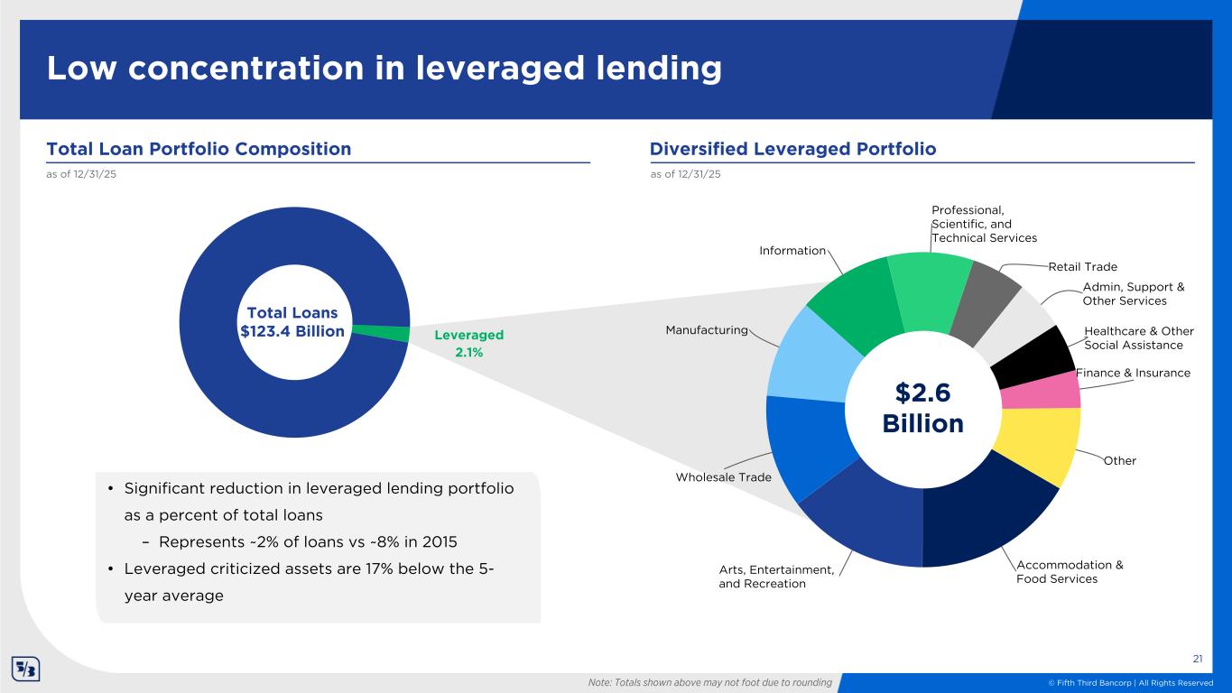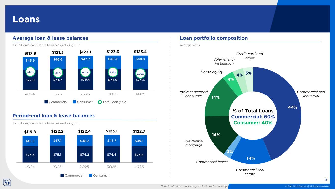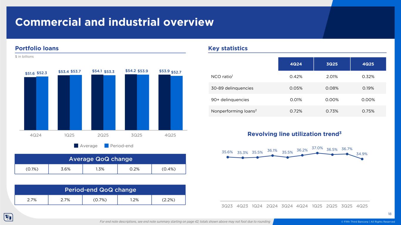 © Fifth Third Bancorp | All Rights Reserved Portfolio loans 40% 22% 18% 7% 5% 5%3% 50%50% Commercial real estate overview CRE mortgage Balance by occupancy CRE construction Balance by property type Other Retail Office Hospitality Industrial Home builder Non-Owner occupied Owner occupied Hospitality 22% Retail 20% Multifamily 20% Medical Office 16% Office 11% Industrial 7% Non-owner occupied property type mix $17.5 $18.2 $18.2 $17.6 $17.5$17.8 $18.3 $17.7 $17.3 $17.5 $5.7 $5.8 $5.8 $5.5 $5.4 $11.8 $12.4 $12.4 $12.0 $12.1 $5.6 $6.0 $5.6 $5.3 $5.3 $12.2 $12.4 $12.1 $11.9 $12.2 4Q24 1Q25 2Q25 3Q25 4Q25 22 Other 4% For end note descriptions, see end note summary starting on page 42; totals shown above may not foot due to rounding Period-end QoQ change 2.8% 2.7% (3.5%) (2.3%) 1.7% $ in billions Average QoQ change 0.1% 3.8% 0.3% (3.6%) (0.5%) 4Q24 3Q25 4Q25 NCO ratio1 0.00% 0.03% 0.14% 30-89 delinquencies 0.05% 0.37% 0.01% 90+ delinquencies 0.00% 0.00% 0.01% Nonperforming loans2 0.45% 0.24% 0.19% Key statistics Period-end - Commercial mortgageAverage - Commercial mortgage Period-end - Commercial constructionAverage - Commercial construction Multifamily