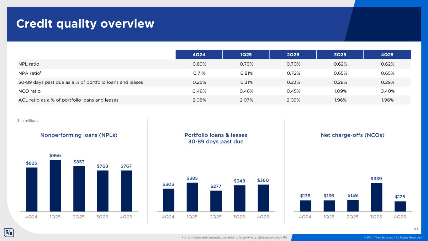 © Fifth Third Bancorp | All Rights Reserved 4.50% 4.50% 4.50% 4.25% 3.75% 2.04% 1.84% 1.80% 1.81% 1.71% Fed Funds Rate Total Cost of Deposits 4Q24 1Q25 2Q25 3Q25 4Q25 Total cost of deposits Total deposit mixAverage deposit balances $167.2 $164.2 $163.6 $164.8 $168.4 $164.7 $161.8 $161.4 $162.5 $166.4 2.68% 2.42% 2.39% 2.41% 2.28% Core Deposits CDs > $250K Total interest-bearing deposit costs 4Q24 1Q25 2Q25 3Q25 4Q25 $ in billions Demand, 25% Interest checking, 35% Money market and savings, 33% Time deposits, 7% $ in billions $168B Average Deposits $164.7 $161.8 $161.4 $162.5 $166.4 $124.6 $122.0 $120.5 $121.3 $124.7 $40.1 $39.8 $40.9 $41.2 $41.8 24.3% 24.6% 25.3% 25.4% 25.1% Interest-Bearing $ Non Interest-Bearing $ Non Interest-Bearing % 4Q24 1Q25 2Q25 3Q25 4Q25 Non interest-bearing to core deposit trend (average) $ in billions Deposits Note: Totals shown above may not foot due to rounding 9
