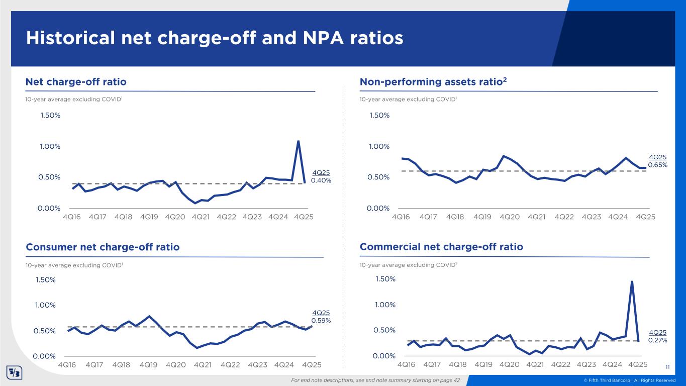 © Fifth Third Bancorp | All Rights Reserved Net charge-offs (NCOs) $136 $136 $139 $339 $125 $136 $136 $139 $339 4Q24 1Q25 2Q25 3Q25 4Q25 Credit quality overview 10 4Q24 1Q25 2Q25 3Q25 4Q25 NPL ratio 0.69% 0.79% 0.70% 0.62% 0.62% NPA ratio1 0.71% 0.81% 0.72% 0.65% 0.65% 30-89 days past due as a % of portfolio loans and leases 0.25% 0.31% 0.23% 0.28% 0.29% NCO ratio 0.46% 0.46% 0.45% 1.09% 0.40% ACL ratio as a % of portfolio loans and leases 2.08% 2.07% 2.09% 1.96% 1.96% Nonperforming loans (NPLs) $823 $966 $853 $768 $767 4Q24 1Q25 2Q25 3Q25 4Q25 Portfolio loans & leases 30-89 days past due $303 $385 $277 $348 $360 4Q24 1Q25 2Q25 3Q25 4Q25 $ in millions For end note descriptions, see end note summary starting on page 42