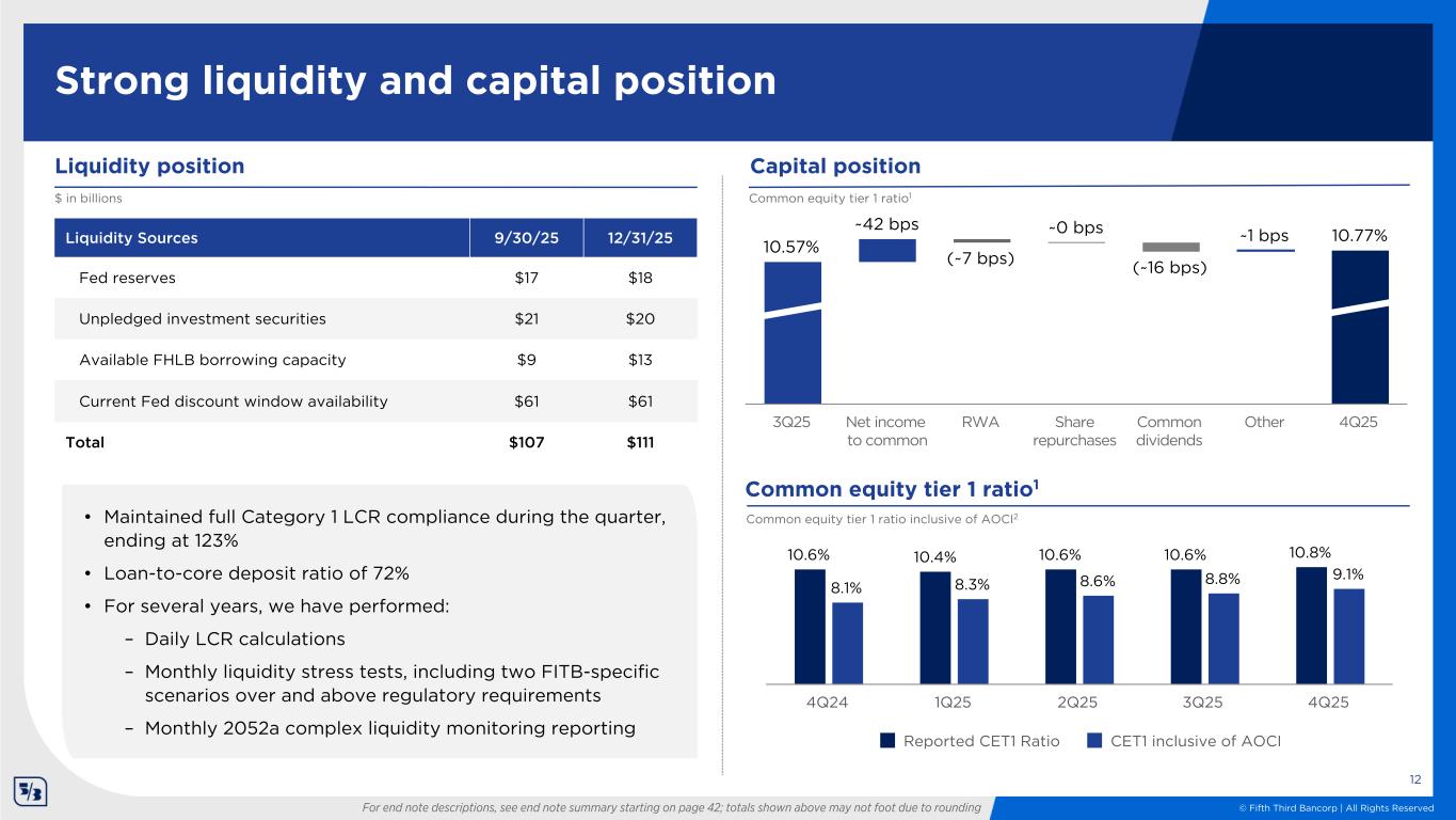 © Fifth Third Bancorp | All Rights Reserved 4Q16 4Q17 4Q18 4Q19 4Q20 4Q21 4Q22 4Q23 4Q24 4Q25 0.00% 0.50% 1.00% 1.50% Historical net charge-off and NPA ratios Net charge-off ratio Non-performing assets ratio2 4Q16 4Q17 4Q18 4Q19 4Q20 4Q21 4Q22 4Q23 4Q24 4Q25 0.00% 0.50% 1.00% 1.50% Commercial net charge-off ratio 4Q16 4Q17 4Q18 4Q19 4Q20 4Q21 4Q22 4Q23 4Q24 4Q25 0.00% 0.50% 1.00% 1.50% 4Q16 4Q17 4Q18 4Q19 4Q20 4Q21 4Q22 4Q23 4Q24 4Q25 0.00% 0.50% 1.00% 1.50% Consumer net charge-off ratio 4Q25 0.27% 4Q25 0.40% 4Q25 0.65% 4Q25 0.59% 10-year average excluding COVID1 10-year average excluding COVID1 10-year average excluding COVID1 10-year average excluding COVID1 For end note descriptions, see end note summary starting on page 42 11