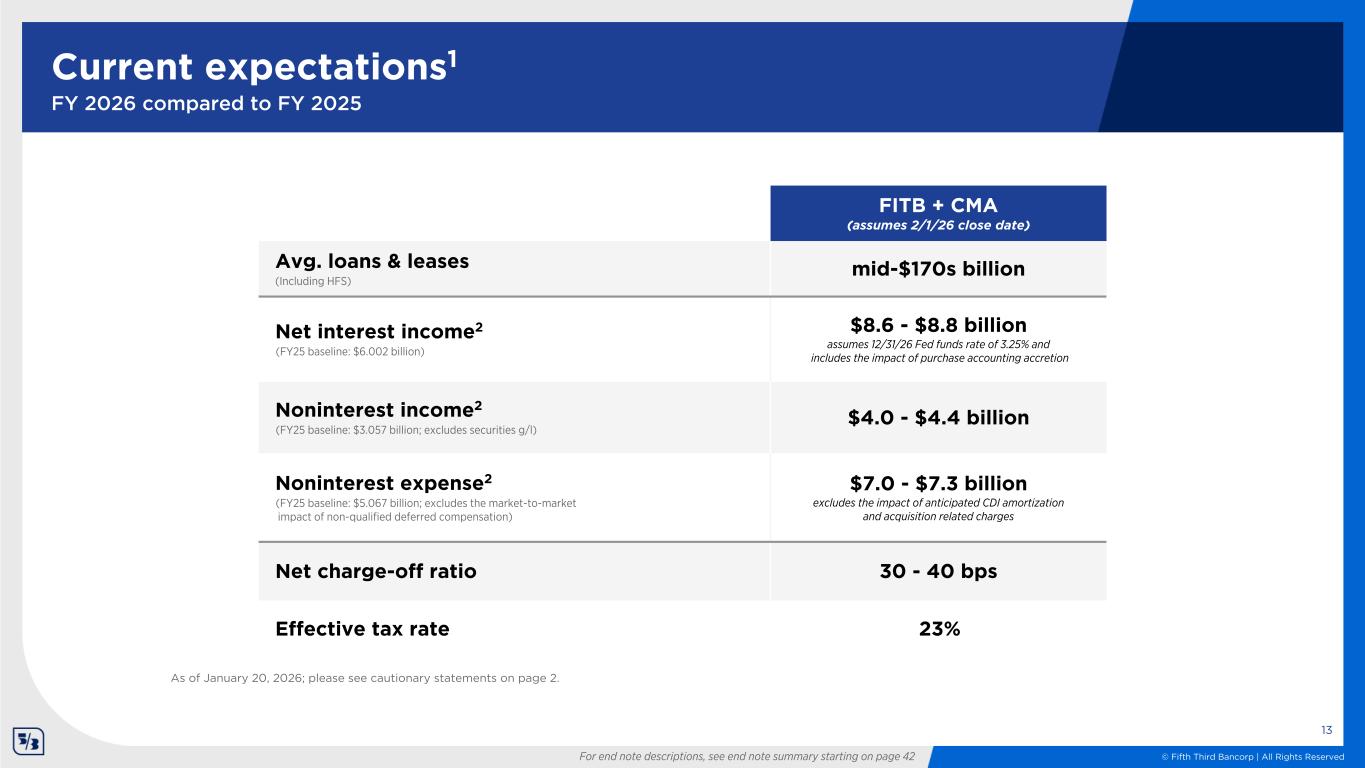 © Fifth Third Bancorp | All Rights Reserved As of January 20, 2026; please see cautionary statements on page 2. Current expectations1 FY 2026 compared to FY 2025 13 For end note descriptions, see end note summary starting on page 42 FITB + CMA (assumes 2/1/26 close date) Avg. loans & leases (Including HFS) mid-$170s billion Net interest income2 (FY25 baseline: $6.002 billion) $8.6 - $8.8 billion assumes 12/31/26 Fed funds rate of 3.25% and includes the impact of purchase accounting accretion Noninterest income2 (FY25 baseline: $3.057 billion; excludes securities g/l) $4.0 - $4.4 billion Noninterest expense2 (FY25 baseline: $5.067 billion; excludes the market-to-market impact of non-qualified deferred compensation) $7.0 - $7.3 billion excludes the impact of anticipated CDI amortization and acquisition related charges Net charge-off ratio 30 - 40 bps Effective tax rate 23%