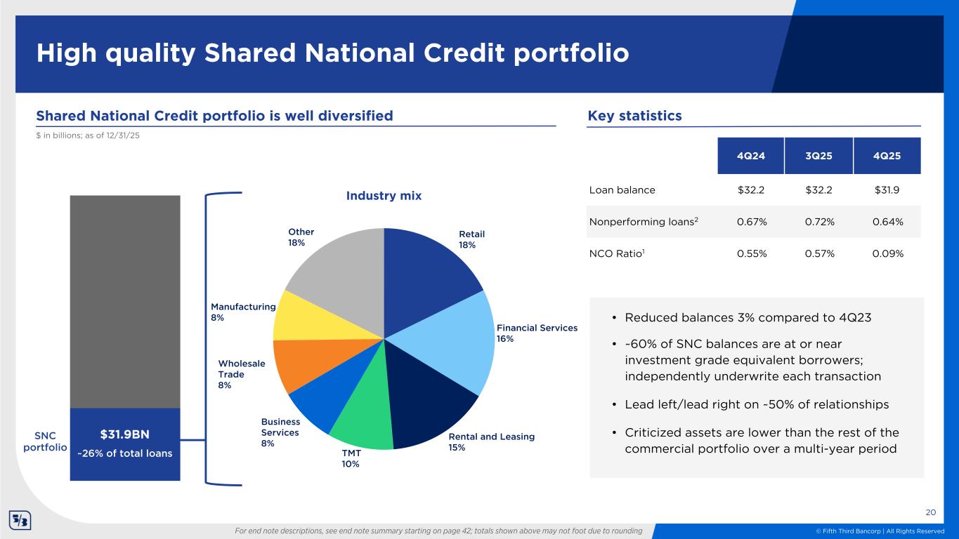 © Fifth Third Bancorp | All Rights Reserved 19 Note: Totals shown above may not foot due to rounding Non-depository financial institution portfolio 31% 27% 18% 12% 11% 2% NDFI portfolio characteristics 4Q25 $9.5B¹ 8% of loans $ in billions; as of 12/31/25 • 4th lowest exposure to NDFIs among peers2 • NDFI portfolio declined 7% from 3Q25 • Zero losses in last 10 years across Real Estate, Subscription Lines and Private Capital Warehouse • 88% of the NDFI portfolio is investment grade or equivalent • 4Q25 criticized rate of ~60 bps • Balanced, deliberate portfolio composition with strong collateral and structural protections Consumer Warehouse Consumer Finance Securitization Vehicles Other Real Estate Institutional CRE, Residential Mortgage Warehouse, Mortgage Servicing Rights Private Capital Warehouse Fund Finance, SBIC, BDC Subscription Lines Capital Call Facilities Corporate Credit Facilities Payments, Insurance, Financial Intermediaries Relationship focused main street lender with lower NDFI exposure
