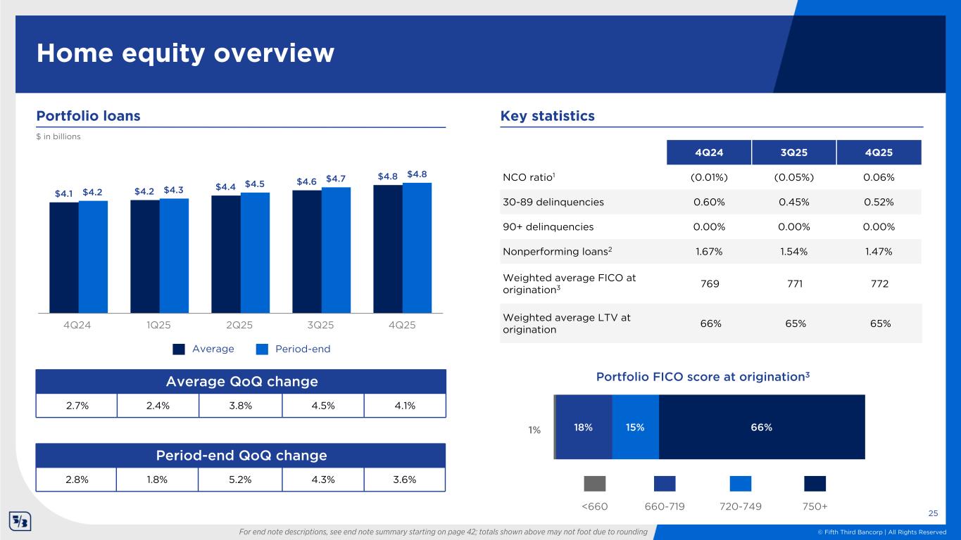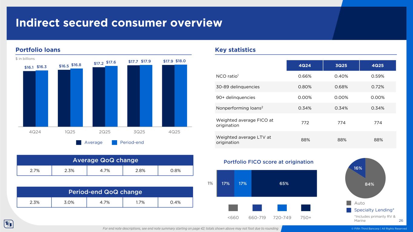 © Fifth Third Bancorp | All Rights Reserved 18% 15% 66% $4.1 $4.2 $4.4 $4.6 $4.8 $4.2 $4.3 $4.5 $4.7 $4.8 4Q24 1Q25 2Q25 3Q25 4Q25 Weighted average FICO at origination3 769 771 772 Weighted average LTV at origination 66% 65% 65% Home equity overview 25 1% For end note descriptions, see end note summary starting on page 42; totals shown above may not foot due to rounding Period-end QoQ change 2.8% 1.8% 5.2% 4.3% 3.6% Average QoQ change 2.7% 2.4% 3.8% 4.5% 4.1% $ in billions Portfolio loans Period-endAverage 750+720-749<660 660-719 Portfolio FICO score at origination3 4Q24 3Q25 4Q25 NCO ratio1 (0.01%) (0.05%) 0.06% 30-89 delinquencies 0.60% 0.45% 0.52% 90+ delinquencies 0.00% 0.00% 0.00% Nonperforming loans2 1.67% 1.54% 1.47% Key statistics