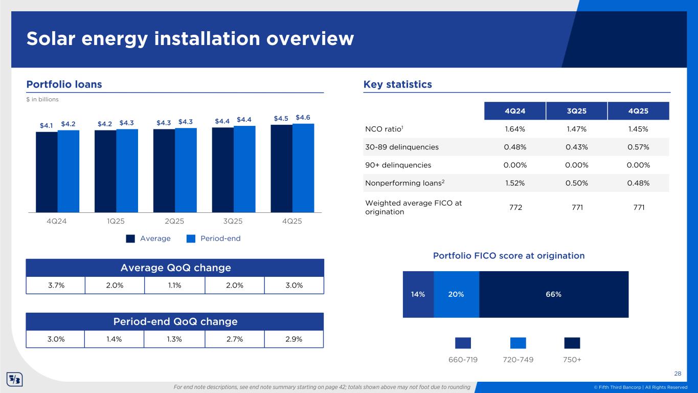 © Fifth Third Bancorp | All Rights Reserved $4.1 $4.2 $4.3 $4.4 $4.5 $4.2 $4.3 $4.3 $4.4 $4.6 4Q24 1Q25 2Q25 3Q25 4Q25 14% 20% 66% Weighted average FICO at origination 772 771 771 Solar energy installation overview 28 For end note descriptions, see end note summary starting on page 42; totals shown above may not foot due to rounding Period-end QoQ change 3.0% 1.4% 1.3% 2.7% 2.9% Average QoQ change 3.7% 2.0% 1.1% 2.0% 3.0% $ in billions Portfolio loans 4Q24 3Q25 4Q25 NCO ratio1 1.64% 1.47% 1.45% 30-89 delinquencies 0.48% 0.43% 0.57% 90+ delinquencies 0.00% 0.00% 0.00% Nonperforming loans2 1.52% 0.50% 0.48% Key statistics Period-endAverage Portfolio FICO score at origination 750+720-749660-719