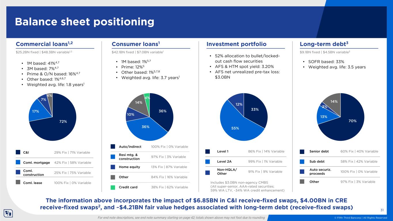 © Fifth Third Bancorp | All Rights Reserved Balance sheet positioning 31 For end note descriptions, see end note summary starting on page 42; totals shown above may not foot due to rounding C&I 29% Fix | 71% Variable Coml. mortgage 42% Fix | 58% Variable Coml. construction 25% Fix | 75% Variable Coml. lease 100% Fix | 0% Variable 33% 55% 12% 72% 17% 7% 4% • 52% allocation to bullet/locked- out cash flow securities • AFS & HTM spot yield: 3.20% • AFS net unrealized pre-tax loss: $3.0BN $25.2BN fixed | $48.3BN variable1,2 Commercial loans1,2 Investment portfolioConsumer loans1 Long-term debt3 $42.1BN fixed | $7.0BN variable1 $9.1BN fixed | $4.5BN variable3 • 1M based: 41%4,7 • 3M based: 7%4,7 • Prime & O/N based: 16%4,7 • Other based: 1%4,6,7 • Weighted avg. life: 1.8 years1 • 1M based: 1%5,7 • Prime: 12%5 • Other based: 1%5,7,8 • Weighted avg. life: 3.7 years1 • SOFR based: 33% • Weighted avg. life: 3.5 years Includes $3.0BN non-agency CMBS (All super-senior, AAA-rated securities; 59% WA LTV, ~34% WA credit enhancement) 36% 36% 10% 14% 4% 70% 13% 3% 14% The information above incorporates the impact of $6.85BN in C&I receive-fixed swaps, $4.00BN in CRE receive-fixed swaps2, and ~$4.21BN fair value hedges associated with long-term debt (receive-fixed swaps) Auto/indirect 100% Fix | 0% Variable Resi mtg. & construction 97% Fix | 3% Variable Home equity 13% Fix | 87% Variable Other 84% Fix | 16% Variable Credit card 38% Fix | 62% Variable Level 1 86% Fix | 14% Variable Level 2A 99% Fix | 1% Variable Non-HQLA/ Other 91% Fix | 9% Variable Senior debt 60% Fix | 40% Variable Sub debt 58% Fix | 42% Variable Auto securiz. proceeds 100% Fix | 0% Variable Other 97% Fix | 3% Variable
