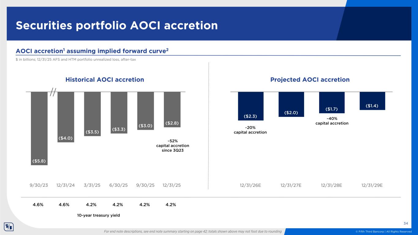 © Fifth Third Bancorp | All Rights Reserved 33 Investment portfolio composition Investment portfolio characteristics Held-to-maturity portfolio • $11.4BN portfolio • Reclassification during 1Q24 aimed to de-risk potential AOCI volatility to capital under proposed capital rules • Securities selected for HTM meet Reg YY eligibility and inclusion requirements Available-for-sale portfolio • $39.1BN portfolio • $3.0BN Non-agency CMBS portfolio – All positions are super-senior AAA rated with WA credit enhancement of 34% – Securities are 20% risk-weighted and are pledgeable to the FHLB – Underlying loans in our structures have a WA LTV of ~59% – Credit risk team analyzes transactions at the underlying property- level, similar to what we do for all our CRE loan commitments HTM 23% AFS 77% AFS and HTM portfolio; amortized cost basis; as of 12/31/25 Amortized cost basis; as of 12/31/25 Securities mix Agency CMBS Agency RMBS Non- agency CMBS Treasuries Other Effective duration HTM 34% 44% — 21% — 5.1 AFS 57% 23% 8% 4% 8% 3.8 Total 52% 28% 6% 8% 6% 4.1 Securities portfolio Securities portfolio $50BN ~26% of interest earning assets ‒ Leverage analytical tools with over 40+ years of historical data to stress the securities at an individual property level on a recurring basis, including significant market distress in real estate valuations Note: Totals shown above may not foot due to rounding