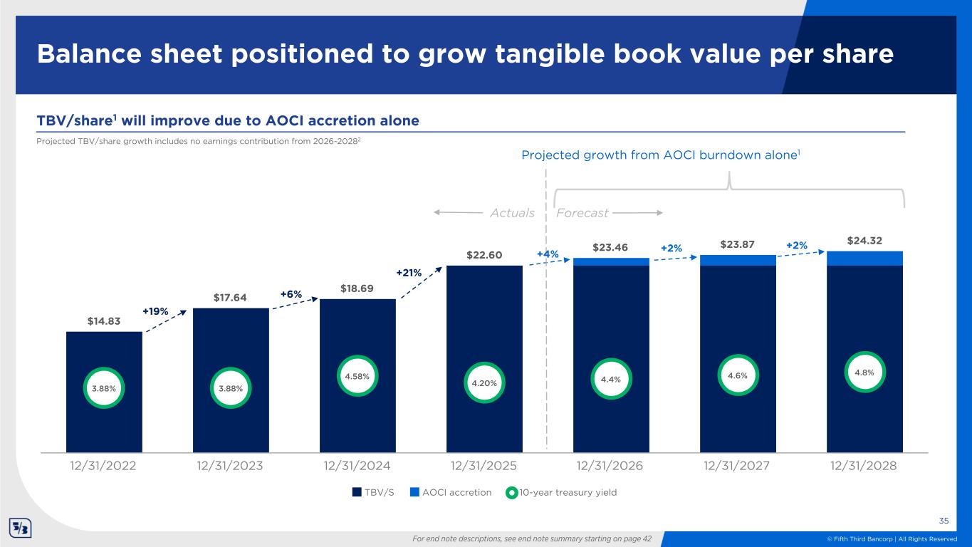 © Fifth Third Bancorp | All Rights Reserved 10-year treasury yield ($5.8) ($4.0) ($3.5) ($3.3) ($3.0) ($2.8) 9/30/23 12/31/24 3/31/25 6/30/25 9/30/25 12/31/25 Projected AOCI accretion ($2.3) ($2.0) ($1.7) ($1.4) 12/31/26E 12/31/27E 12/31/28E 12/31/29E Securities portfolio AOCI accretion 34 $ in billions; 12/31/25 AFS and HTM portfolio unrealized loss, after-tax ~40% capital accretion ~20% capital accretion Historical AOCI accretion ~52% capital accretion since 3Q23 AOCI accretion1 assuming implied forward curve2 4.2%4.6% 4.2% 4.2% 4.2% For end note descriptions, see end note summary starting on page 42; totals shown above may not foot due to rounding 4.6%