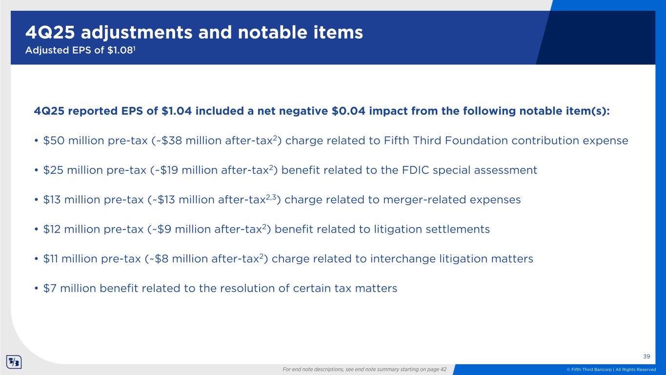 © Fifth Third Bancorp | All Rights Reserved 4Q25 reported EPS of $1.04 included a net negative $0.04 impact from the following notable item(s): • $50 million pre-tax (~$38 million after-tax2) charge related to Fifth Third Foundation contribution expense • $25 million pre-tax (~$19 million after-tax2) benefit related to the FDIC special assessment • $13 million pre-tax (~$13 million after-tax2,3) charge related to merger-related expenses • $12 million pre-tax (~$9 million after-tax2) benefit related to litigation settlements • $11 million pre-tax (~$8 million after-tax2) charge related to interchange litigation matters • $7 million benefit related to the resolution of certain tax matters 4Q25 adjustments and notable items Adjusted EPS of $1.081 39 For end note descriptions, see end note summary starting on page 42