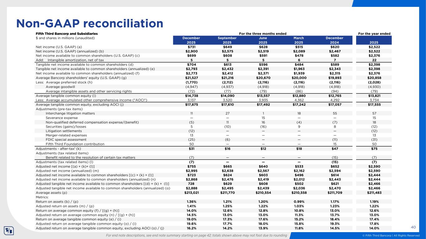 © Fifth Third Bancorp | All Rights Reserved Fifth Third Bancorp and Subsidiaries For the three months ended For the year ended $ and shares in millions (unaudited) December September June March December 2025 2025 2025 2025 2024 2025 Net income (U.S. GAAP) (a) $731 $649 $628 $515 $620 $2,522 Net income (U.S. GAAP) (annualized) (b) $2,900 $2,575 $2,519 $2,089 $2,467 $2,522 Net income available to common shareholders (U.S. GAAP) (c) $699 $608 $591 $478 $582 $2,376 Add: Intangible amortization, net of tax 5 5 5 6 7 22 Tangible net income available to common shareholders (d) $704 $613 $596 $484 $589 $2,398 Tangible net income available to common shareholders (annualized) (e) $2,793 $2,432 $2,391 $1,963 $2,343 $2,398 Net income available to common shareholders (annualized) (f) $2,773 $2,412 $2,371 $1,939 $2,315 $2,376 Average Bancorp shareholders' equity (U.S. GAAP) (g) $21,527 $21,216 $20,670 $20,000 $19,893 $20,858 Less: Average preferred stock (h) (1,770) (2,112) (2,116) (2,116) (2,116) (2,028) Average goodwill (4,947) (4,937) (4,918) (4,918) (4,918) (4,930) Average intangible assets and other servicing rights (72) (77) (79) (86) (94) (79) Average tangible common equity (i) $14,738 $14,090 $13,557 $12,880 $12,765 $13,821 Less: Average accumulated other comprehensive income ("AOCI") 3,137 3,520 3,935 4,362 4,292 3,734 Average tangible common equity, excluding AOCI (j) $17,875 $17,610 $17,492 $17,242 $17,057 $17,555 Adjustments (pre-tax items) Interchange litigation matters 11 27 1 18 55 57 Severance expense — — 15 — — 15 Non-qualified deferred compensation expense/(benefit) (5) 11 16 (4) (7) 18 Securities (gains)/losses 5 (10) (16) 9 8 (12) Litigation settlements (12) — — — — (12) Merger-related expenses 13 — — — — 13 FDIC special assessment (25) (6) — — (11) (31) Fifth Third Foundation contribution 50 — — — 15 50 Adjustments - after-tax1 (k) $31 $16 $12 $18 $47 $75 Adjustments (tax related items) Benefit related to the resolution of certain tax matters (7) — — — (15) (7) Adjustments (tax related items) (l) (7) — — — (15) (7) Adjusted net income [(a) + (k)+ (l)] $755 $665 $640 $533 $652 $2,590 Adjusted net income (annualized) (m) $2,995 $2,638 $2,567 $2,162 $2,594 $2,590 Adjusted net income available to common shareholders [(c) + (k) + (l)] $723 $624 $603 $496 $614 $2,444 Adjusted net income available to common shareholders (annualized) (n) $2,868 $2,476 $2,419 $2,012 $2,443 $2,444 Adjusted tangible net income available to common shareholders [(d) + (k) + (l)] 728 $629 $608 $502 $621 $2,466 Adjusted tangible net income available to common shareholders (annualized) (o) $2,888 $2,495 $2,439 $2,036 $2,470 $2,466 Average assets (p) $213,021 $211,770 $210,554 $210,558 $211,709 $211,483 Metrics: Return on assets (b) / (p) 1.36% 1.21% 1.20% 0.99% 1.17% 1.19% Adjusted return on assets (m) / (p) 1.41% 1.25% 1.22% 1.03% 1.23% 1.22% Return on average common equity (f) / [(g) + (h)] 14.0% 12.6% 12.8% 10.8% 13.0% 12.6% Adjusted return on average common equity (n) / [(g) + (h)] 14.5% 13.0% 13.0% 11.3% 13.7% 13.0% Return on average tangible common equity (e) / (i) 19.0% 17.3% 17.6% 15.2% 18.4% 17.4% Adjusted return on average tangible common equity (o) / (i) 19.6% 17.7% 18.0% 15.8% 19.3% 17.8% Adjusted return on average tangible common equity, excluding AOCI (o) / (j) 16.2% 14.2% 13.9% 11.8% 14.5% 14.0% 40 Non-GAAP reconciliation For end note descriptions, see end note summary starting on page 42; totals shown above may not foot due to rounding