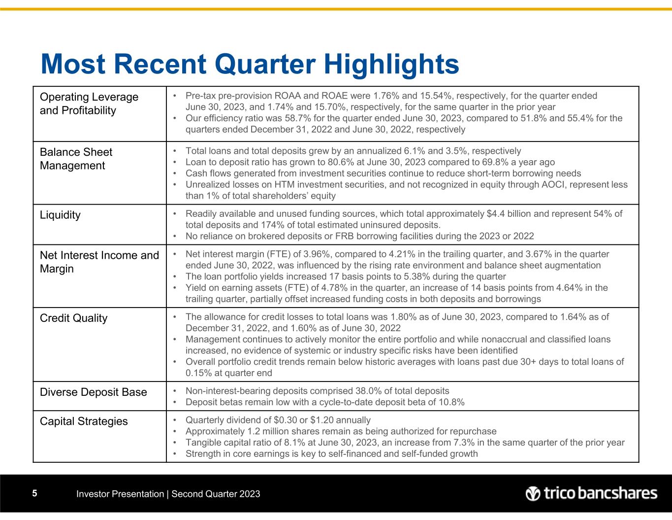 Agenda • Most Recent Quarter Recap • Company Overview • Lending Overview • Deposit Overview • Financials 4 • Judi Giem, SVP & Chief Human Resources Officer • Peter Wiese, EVP & Chief Financial Officer • Dan Bailey, EVP & Chief Banking Officer • Rick Smith, President & Chief Executive Officer • John Fleshood, EVP & Chief Operating Officer • Craig Carney, EVP & Chief Credit Officer • Greg Gehlmann, SVP & General Counsel Executive Team (left to right) 4 Investor Presentation | Second Quarter 2023