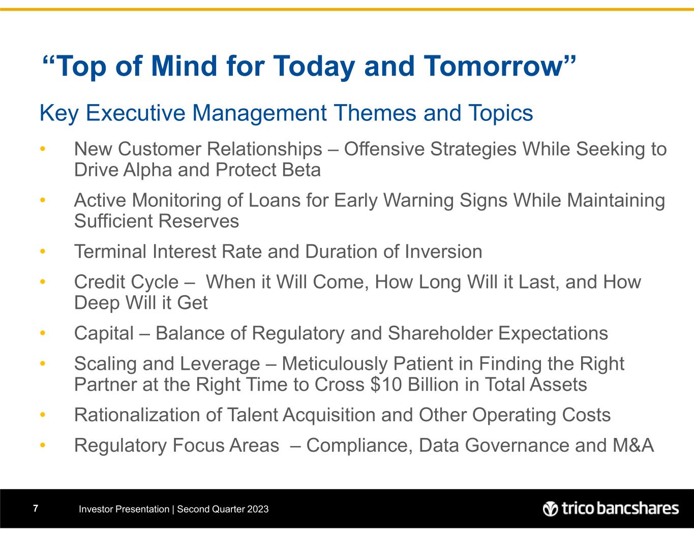 Company Overview Investor Presentation | Second Quarter 20236 Nasdaq: TCBK Headquarters: Chico, California Stock Price*: $33.20 Market Cap.: $1.10 Billion Asset Size: $9.85 Billion Loans: $6.52 Billion Deposits: $8.10 Billion Bank Branches: 69 ATMs: 87 Bank ATMs, with access to ~ 40,000 in network Market Area: TriCo currently serves 31 counties throughout California • As of close of business June 30, 2023