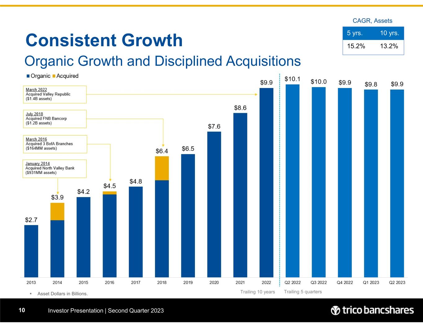 Consistent Growth Investor Presentation | Second Quarter 202310 Organic Growth and Disciplined Acquisitions  Asset Dollars in Billions. 5 yrs. 10 yrs. 15.2% 13.2% CAGR, Assets Trailing 10 years Trailing 5 quarters