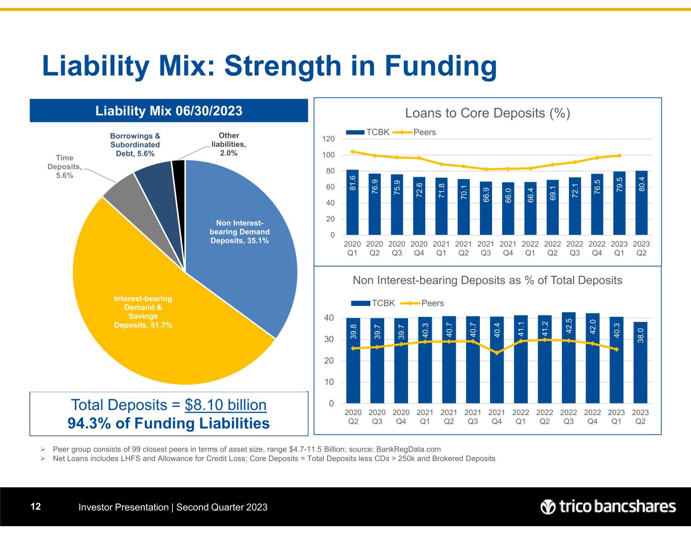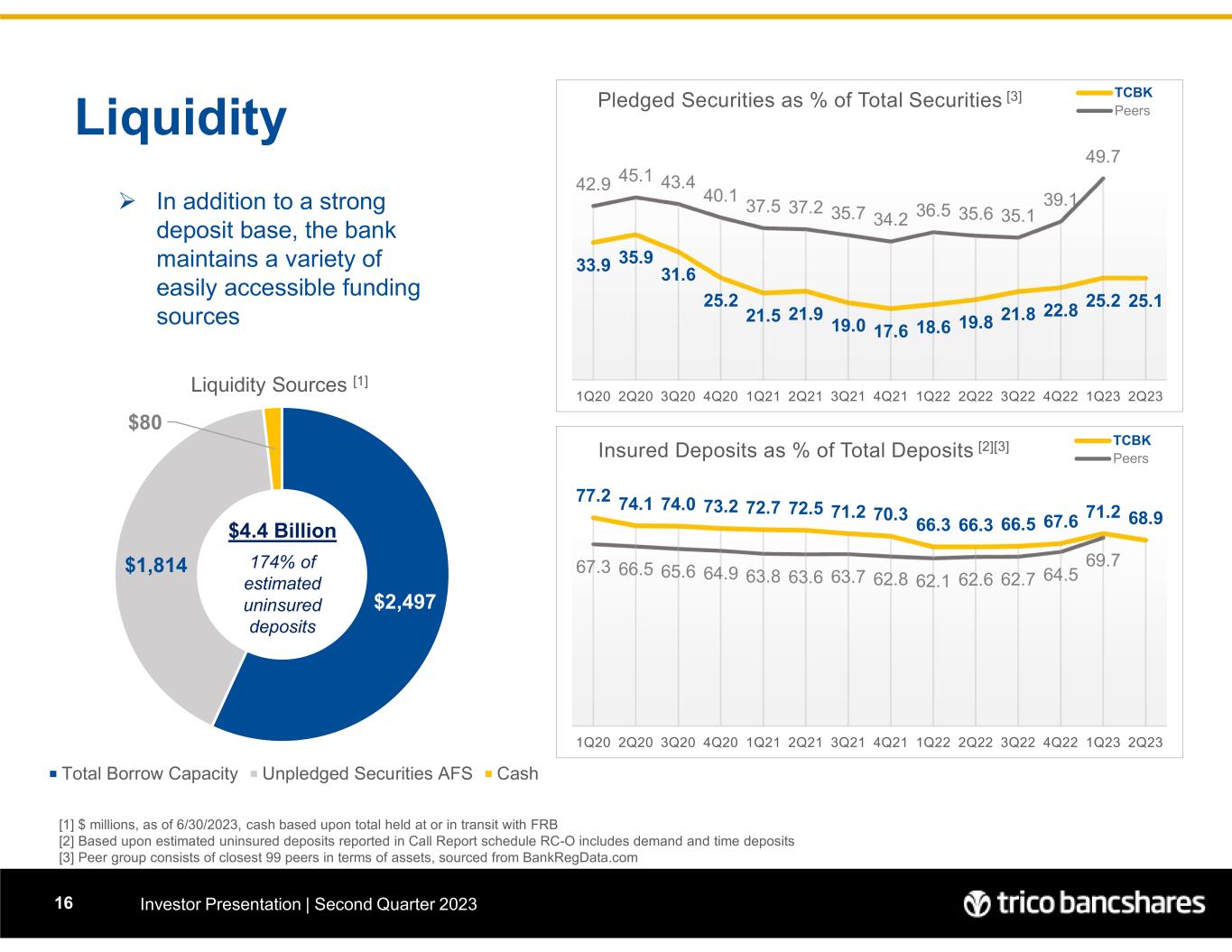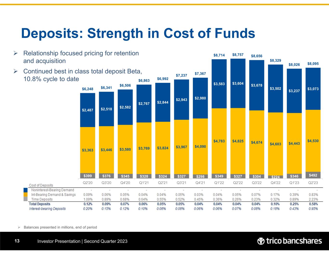 Liability Mix: Strength in Funding Investor Presentation | Second Quarter 202312 Total Deposits = $8.10 billion 94.3% of Funding Liabilities Liability Mix 06/30/2023  Peer group consists of 99 closest peers in terms of asset size, range $4.7-11.5 Billion; source: BankRegData.com  Net Loans includes LHFS and Allowance for Credit Loss; Core Deposits = Total Deposits less CDs > 250k and Brokered Deposits (0.03% Funding Cost) Non Interest- bearing Demand Deposits, 35.1% Interest-bearing Demand & Savings Deposits, 51.7% Time Deposits, 5.6% Borrowings & Subordinated Debt, 5.6% Other liabilities, 2.0% 8 1 .6 7 6 .9 7 5 .9 7 2 .6 7 1 .8 7 0 .1 6 6 .9 6 6 .0 6 6 .4 6 9 .1 7 2 .1 7 6 .5 7 9 .5 8 0 .4 0 20 40 60 80 100 120 2020 Q1 2020 Q2 2020 Q3 2020 Q4 2021 Q1 2021 Q2 2021 Q3 2021 Q4 2022 Q1 2022 Q2 2022 Q3 2022 Q4 2023 Q1 2023 Q2 Loans to Core Deposits (%) TCBK Peers 3 9 .8 3 9 .7 3 9 .7 4 0 .3 4 0 .7 4 0 .7 4 0 .4 4 1 .1 4 1 .2 4 2 .5 4 2 .0 4 0 .3 3 8 .0 0 10 20 30 40 2020 Q2 2020 Q3 2020 Q4 2021 Q1 2021 Q2 2021 Q3 2021 Q4 2022 Q1 2022 Q2 2022 Q3 2022 Q4 2023 Q1 2023 Q2 Non Interest-bearing Deposits as % of Total Deposits TCBK Peers