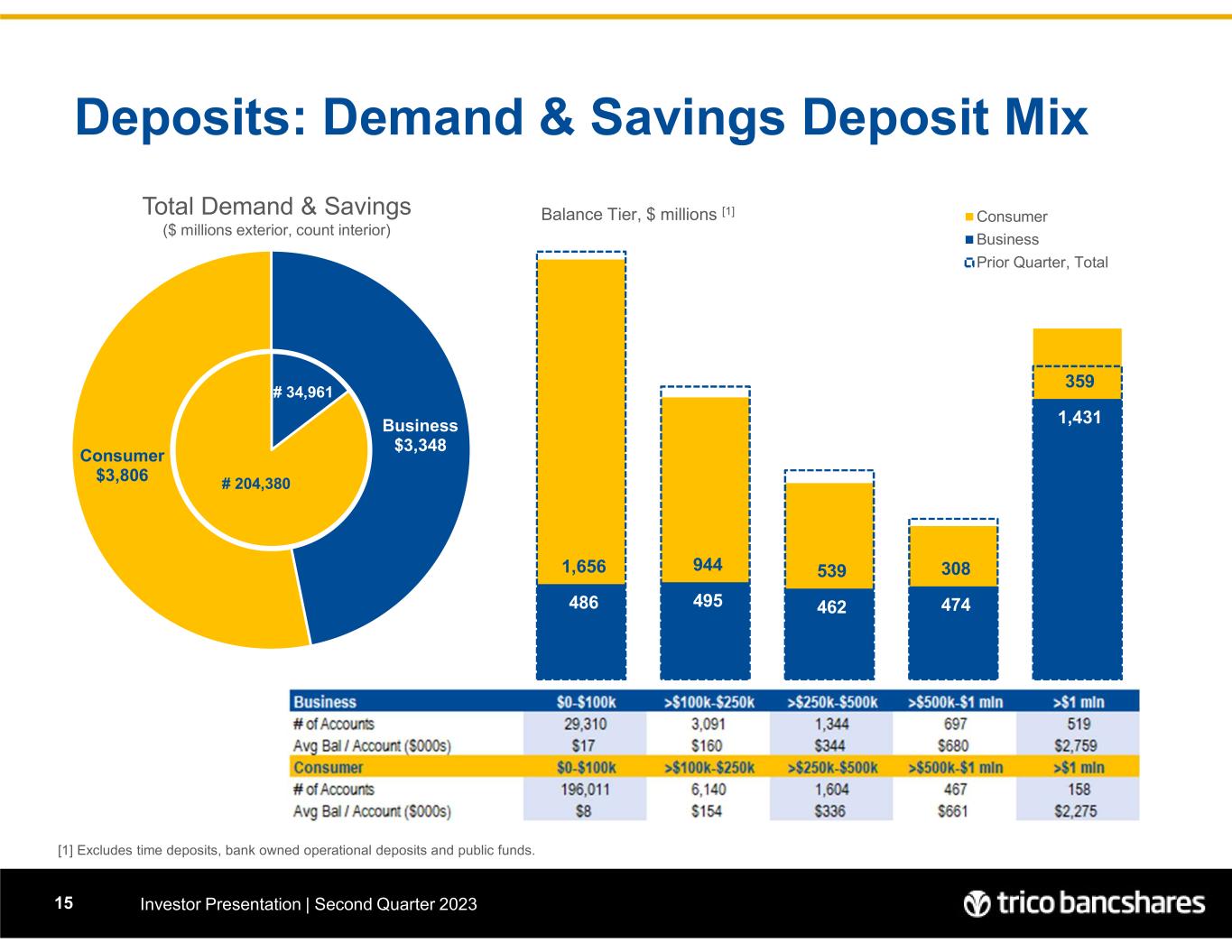 $186 $178 $134 $132 $310 - 100 200 300 400 500 600 700 800 $0-$100k >$100k-$250k >$250k - $500k >$500k - $1mln >$1mln $236 $214 $210 $205 $720 - 100 200 300 400 500 600 700 800 $390 $274 $188 $138 $266 - 100 200 300 400 500 600 700 800 $618 $393 $273 $181 $356 - 100 200 300 400 500 600 700 800 G re a te r C h ic o $712 $380 $196 $126 $138 - 100 200 300 400 500 600 700 800 Prior Quarter N o rt h er n Deposits by Region Investor Presentation | Second Quarter 202314  Excludes bank owned operational deposits, public funds, and Direct Banking division. $1.552 billion, total $1.821 billion, total $1.256 billion, total $1.585 billion, total $0.940 billion, total S a cr am en to V a lle y C e nt ra l V a lle y B a y A re a