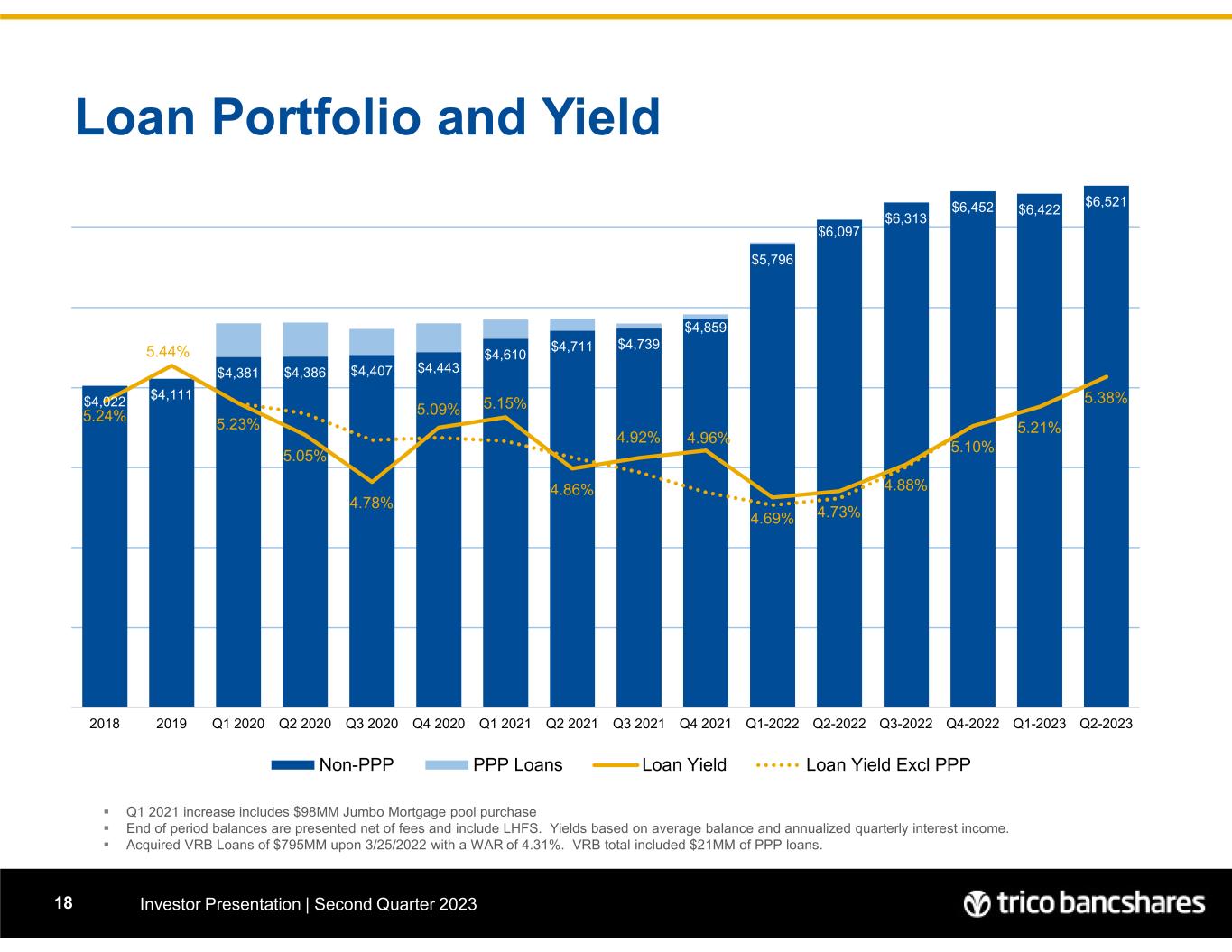 Loan Portfolio and Yield Investor Presentation | Second Quarter 202318  Q1 2021 increase includes $98MM Jumbo Mortgage pool purchase  End of period balances are presented net of fees and include LHFS. Yields based on average balance and annualized quarterly interest income.  Acquired VRB Loans of $795MM upon 3/25/2022 with a WAR of 4.31%. VRB total included $21MM of PPP loans. $4,022 $4,111 $4,381 $4,386 $4,407 $4,443 $4,610 $4,711 $4,739 $4,859 $5,796 $6,097 $6,313 $6,452 $6,422 $6,521 5.24% 5.44% 5.23% 5.05% 4.78% 5.09% 5.15% 4.86% 4.92% 4.96% 4.69% 4.73% 4.88% 5.10% 5.21% 5.38% 3.50% 4.50% 5.50% 6.50% $0 $1,000 $2,000 $3,000 $4,000 $5,000 $6,000 2018 2019 Q1 2020 Q2 2020 Q3 2020 Q4 2020 Q1 2021 Q2 2021 Q3 2021 Q4 2021 Q1-2022 Q2-2022 Q3-2022 Q4-2022 Q1-2023 Q2-2023 Non-PPP PPP Loans Loan Yield Loan Yield Excl PPP
