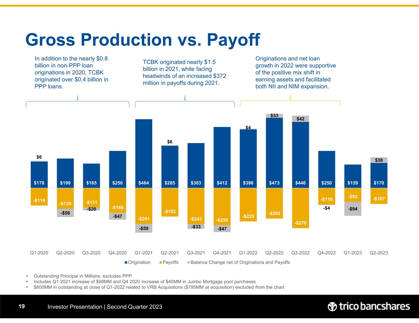 Gross Production vs. Payoff Investor Presentation | Second Quarter 202319  Outstanding Principal in Millions, excludes PPP  Includes Q1 2021 increase of $98MM and Q4 2020 increase of $40MM in Jumbo Mortgage pool purchases  $800MM in outstanding at close of Q1-2022 related to VRB Acquisitions ($795MM at acquisition) excluded from the chart TCBK originated nearly $1.5 billion in 2021, while facing headwinds of an increased $372 million in payoffs during 2021. In addition to the nearly $0.8 billion in non-PPP loan originations in 2020, TCBK originated over $0.4 billion in PPP loans. Originations and net loan growth in 2022 were supportive of the positive mix shift in earning assets and facilitated both NII and NIM expansion. $178 $199 $165 $250 $464 $285 $303 $412 $396 $473 $446 $250 $159 $170 -$118 -$139 -$131 -$166 -$241 -$192 -$243 -$250 -$225 -$205 -$270 -$110 -$92 -$107 $6 -$56 -$20 -$47 -$59 $6 -$33 -$47 $4 $33 $42 -$4 -$94 $38 Q1-2020 Q2-2020 Q3-2020 Q4-2020 Q1-2021 Q2-2021 Q3-2021 Q4-2021 Q1-2022 Q2-2022 Q3-2022 Q4-2022 Q1-2023 Q2-2023 Origination Payoffs Balance Change net of Originations and Payoffs
