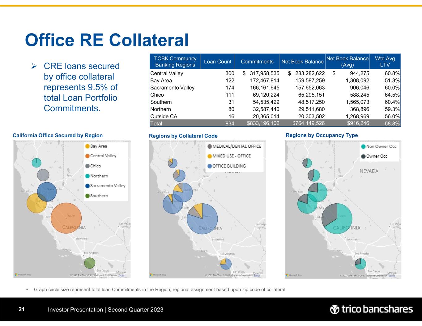 Office RE Collateral Investor Presentation | Second Quarter 202321  Graph circle size represent total loan Commitments in the Region; regional assignment based upon zip code of collateral  CRE loans secured by office collateral represents 9.5% of total Loan Portfolio Commitments. TCBK Community Banking Regions Loan Count Commitments Net Book Balance Net Book Balance (Avg) Wtd Avg LTV Central Valley 300 $ 317,958,535 $ 283,282,622 $ 944,275 60.8% Bay Area 122 172,467,814 159,587,259 1,308,092 51.3% Sacramento Valley 174 166,161,645 157,652,063 906,046 60.0% Chico 111 69,120,224 65,295,151 588,245 64.5% Southern 31 54,535,429 48,517,250 1,565,073 60.4% Northern 80 32,587,440 29,511,680 368,896 59.3% Outside CA 16 20,365,014 20,303,502 1,268,969 56.0% Total 834 $833,196,102 $764,149,526 $916,246 58.8% California Office Secured by Region Regions by Collateral Code Regions by Occupancy Type