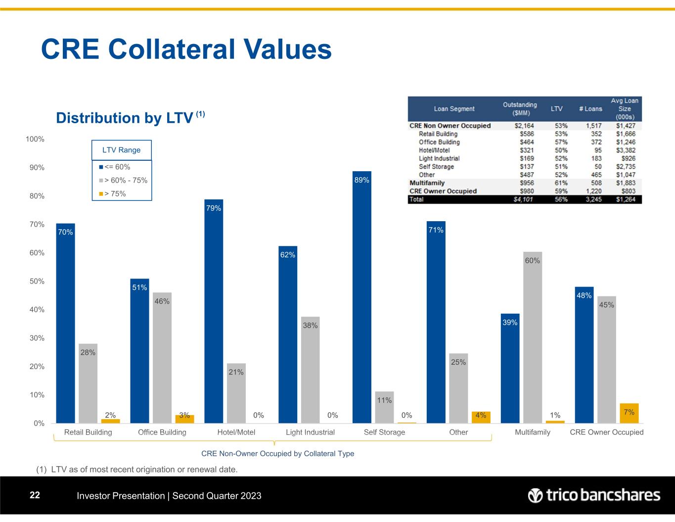 70% 51% 79% 62% 89% 71% 39% 48% 28% 46% 21% 38% 11% 25% 60% 45% 2% 3% 0% 0% 0% 4% 1% 7% 0% 10% 20% 30% 40% 50% 60% 70% 80% 90% 100% Retail Building Office Building Hotel/Motel Light Industrial Self Storage Other Multifamily CRE Owner Occupied <= 60% > 60% - 75% > 75% CRE Collateral Values Investor Presentation | Second Quarter 202322 Distribution by LTV (1) LTV Range (1) LTV as of most recent origination or renewal date. CRE Non-Owner Occupied by Collateral Type