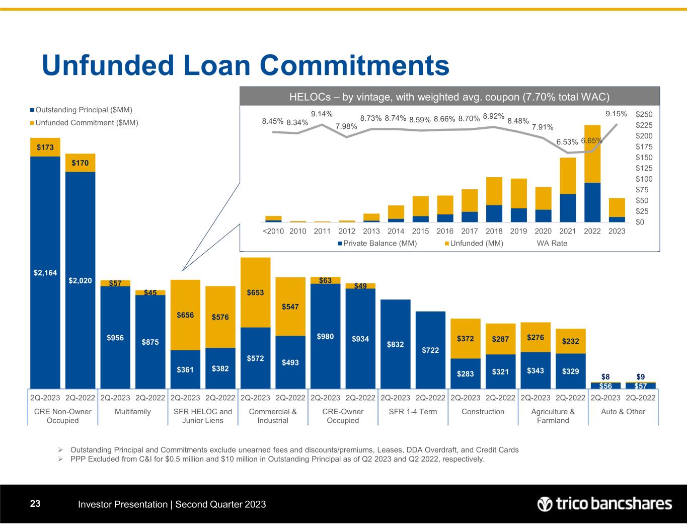 Unfunded Loan Commitments Investor Presentation | Second Quarter 202323 HELOCs – by vintage, with weighted avg. coupon (7.70% total WAC)  Outstanding Principal and Commitments exclude unearned fees and discounts/premiums, Leases, DDA Overdraft, and Credit Cards  PPP Excluded from C&I for $0.5 million and $10 million in Outstanding Principal as of Q2 2023 and Q2 2022, respectively. 0.00% 1.00% 2.00% 3.00% 4.00% 5.00% 6.00% 7.00% 8.00% 9.00% 10.00% $0 $25 $50 $75 $100 $125 $150 $175 $200 $225 $250 20232022202120202019201820172016201520142013201220112010<2010 Private Balance (MM) Unfunded (MM) WA Rate 9.15% 6.65%6.53% 7.91% 8.48% 8.92%8.70%8.66%8.59%8.74%8.73% 7.98% 9.14% 8.34%8.45% $2,164 $2,020 $956 $875 $361 $382 $572 $493 $980 $934 $832 $722 $283 $321 $343 $329 $56 $57 $173 $170 $57 $45 $656 $576 $653 $547 $63 $49 $372 $287 $276 $232 $8 $9 2Q-2023 2Q-2022 2Q-2023 2Q-2022 2Q-2023 2Q-2022 2Q-2023 2Q-2022 2Q-2023 2Q-2022 2Q-2023 2Q-2022 2Q-2023 2Q-2022 2Q-2023 2Q-2022 2Q-2023 2Q-2022 CRE Non-Owner Occupied Multifamily SFR HELOC and Junior Liens Commercial & Industrial CRE-Owner Occupied SFR 1-4 Term Construction Agriculture & Farmland Auto & Other Outstanding Principal ($MM) Unfunded Commitment ($MM)