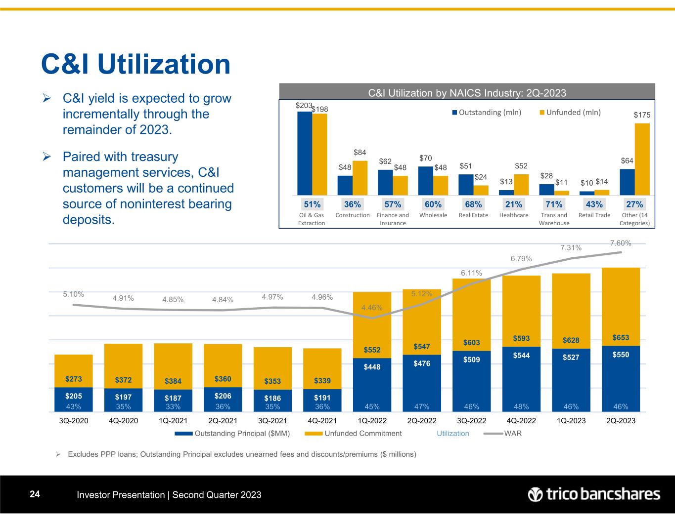 C&I Utilization Investor Presentation | Second Quarter 202324  Excludes PPP loans; Outstanding Principal excludes unearned fees and discounts/premiums ($ millions)  C&I yield is expected to grow incrementally through the remainder of 2023.  Paired with treasury management services, C&I customers will be a continued source of noninterest bearing deposits. C&I Utilization by NAICS Industry: 2Q-2023 $203 $48 $62 $70 $51 $13 $28 $10 $64 $198 $84 $48 $48 $24 $52 $11 $14 $175 51% 36% 57% 60% 68% 21% 71% 43% 27% 0% 5000% 10000% 15000% 20000% Oil & Gas Extraction Construction Finance and Insurance Wholesale Real Estate Healthcare Trans and Warehouse Retail Trade Other (14 Categories) Outstanding (mln) Unfunded (mln) $205 $197 $187 $206 $186 $191 $448 $476 $509 $544 $527 $550 $273 $372 $384 $360 $353 $339 $552 $547 $603 $593 $628 $653 43% 35% 33% 36% 35% 36% 45% 47% 46% 48% 46% 46% 5.10% 4.91% 4.85% 4.84% 4.97% 4.96% 4.46% 5.12% 6.11% 6.79% 7.31% 7.60% 0% 1% 2% 3% 4% 5% 6% 7% 8% $0 $200 $400 $600 $800 $1,000 $1,200 $1,400 3Q-2020 4Q-2020 1Q-2021 2Q-2021 3Q-2021 4Q-2021 1Q-2022 2Q-2022 3Q-2022 4Q-2022 1Q-2023 2Q-2023 Outstanding Principal ($MM) Unfunded Commitment Utilization WAR