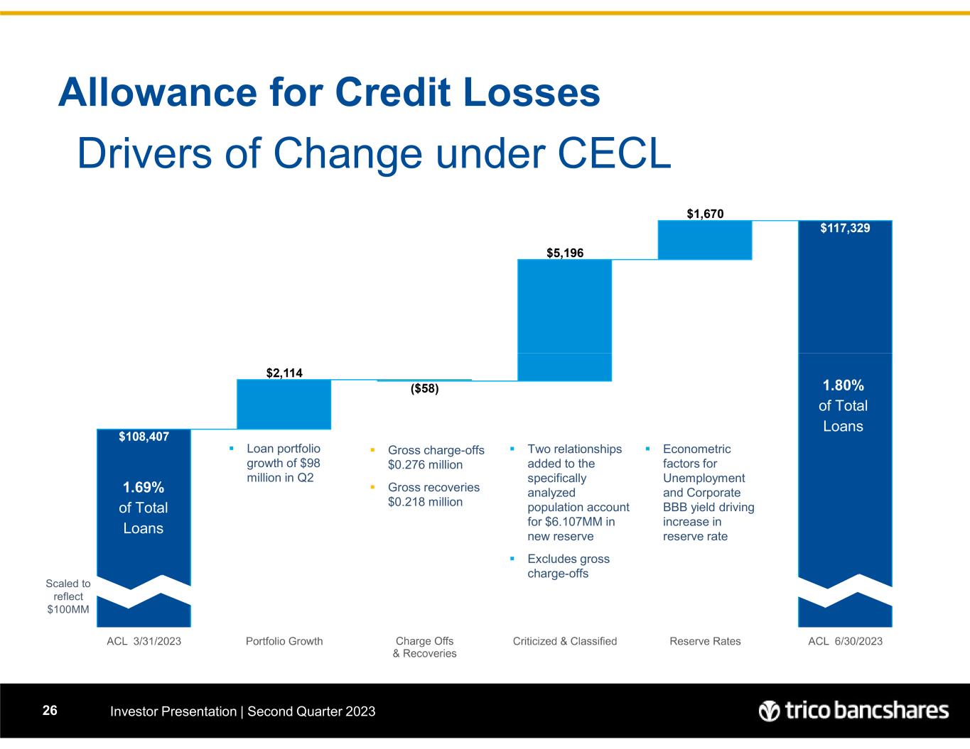 Allowance for Credit Losses Investor Presentation | Second Quarter 202326 Drivers of Change under CECL  Loan portfolio growth of $98 million in Q2  Econometric factors for Unemployment and Corporate BBB yield driving increase in reserve rate  Gross charge-offs $0.276 million  Gross recoveries $0.218 million 1.69% of Total Loans 1.80% of Total Loans  Two relationships added to the specifically analyzed population account for $6.107MM in new reserve  Excludes gross charge-offs Scaled to reflect $100MM