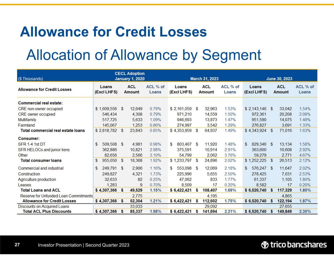 Allowance for Credit Losses Investor Presentation | Second Quarter 202327 Allocation of Allowance by Segment