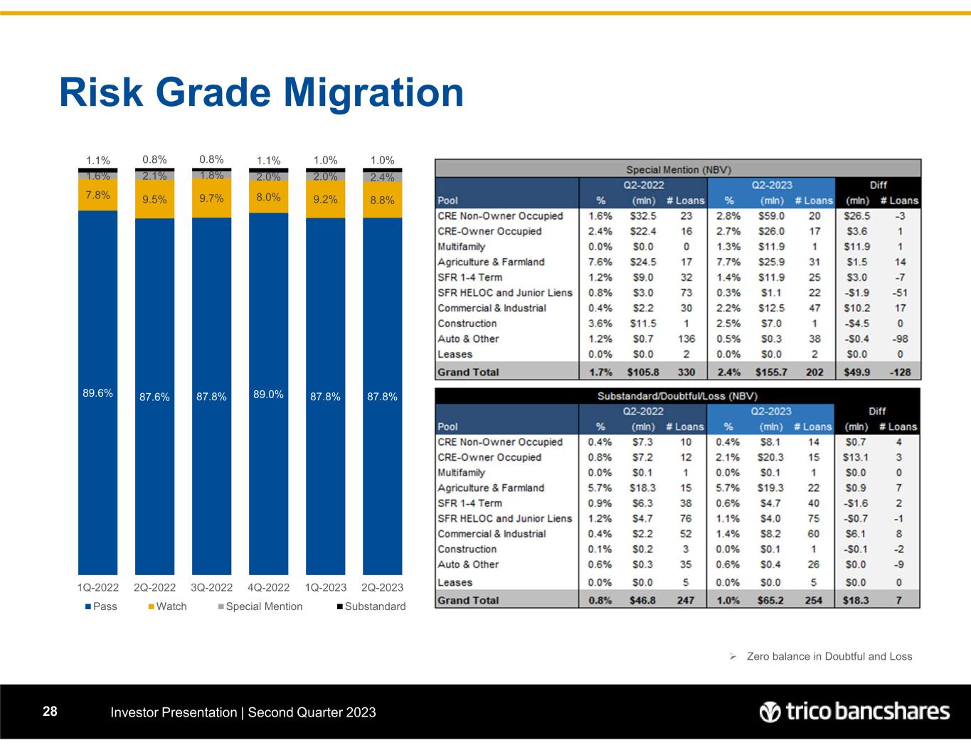 Risk Grade Migration Investor Presentation | Second Quarter 202328  Zero balance in Doubtful and Loss 87.8%87.8%89.0%87.8%87.6%89.6% 8.8%9.2%8.0%9.7%9.5%7.8% 2.4%2.0%2.0%1.8%2.1%1.6% 1.0%1.0%1.1%0.8%0.8%1.1% 2Q-20231Q-20234Q-20223Q-20222Q-20221Q-2022 Pass Watch Special Mention Substandard
