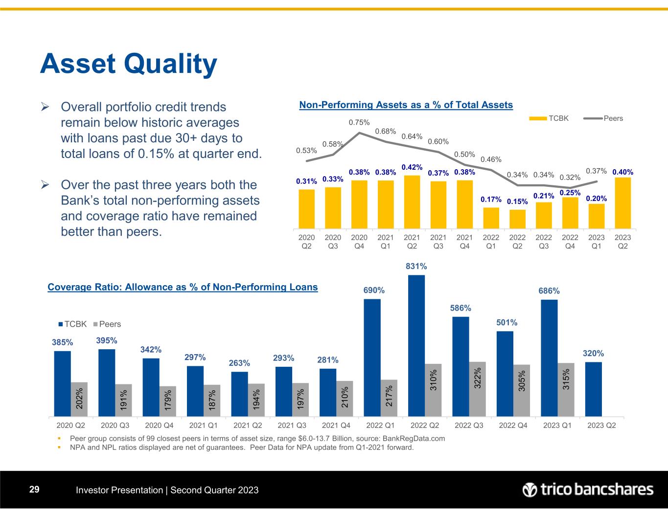 385% 395% 342% 297% 263% 293% 281% 690% 831% 586% 501% 686% 320% 20 2% 19 1% 17 9% 18 7% 19 4% 19 7% 21 0% 21 7% 31 0% 32 2% 30 5% 31 5% 2020 Q2 2020 Q3 2020 Q4 2021 Q1 2021 Q2 2021 Q3 2021 Q4 2022 Q1 2022 Q2 2022 Q3 2022 Q4 2023 Q1 2023 Q2 TCBK Peers Asset Quality Investor Presentation | Second Quarter 202329  Peer group consists of 99 closest peers in terms of asset size, range $6.0-13.7 Billion, source: BankRegData.com  NPA and NPL ratios displayed are net of guarantees. Peer Data for NPA update from Q1-2021 forward. Coverage Ratio: Allowance as % of Non-Performing Loans  Overall portfolio credit trends remain below historic averages with loans past due 30+ days to total loans of 0.15% at quarter end.  Over the past three years both the Bank’s total non-performing assets and coverage ratio have remained better than peers. Non-Performing Assets as a % of Total Assets 0.31% 0.33% 0.38% 0.38% 0.42% 0.37% 0.38% 0.17% 0.15% 0.21% 0.25% 0.20% 0.40% 0.53% 0.58% 0.75% 0.68% 0.64% 0.60% 0.50% 0.46% 0.34% 0.34% 0.32% 0.37% 2020 Q2 2020 Q3 2020 Q4 2021 Q1 2021 Q2 2021 Q3 2021 Q4 2022 Q1 2022 Q2 2022 Q3 2022 Q4 2023 Q1 2023 Q2 TCBK Peers
