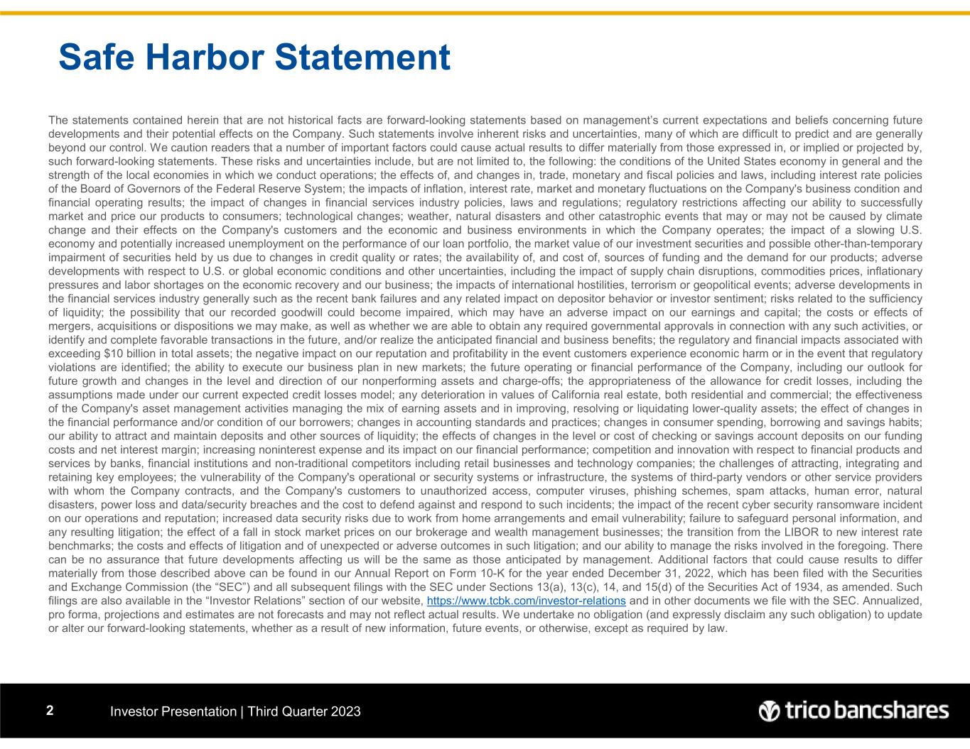 Tri Counties Bank Investor Presentation | Third Quarter 20233