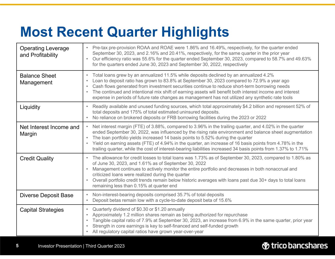 Agenda • Most Recent Quarter Recap • Company Overview • Lending Overview • Deposit Overview • Financials 4 • Judi Giem, SVP & Chief Human Resources Officer • Peter Wiese, EVP & Chief Financial Officer • Dan Bailey, EVP & Chief Banking Officer • Rick Smith, President & Chief Executive Officer • John Fleshood, EVP & Chief Operating Officer • Craig Carney, EVP & Chief Credit Officer • Greg Gehlmann, SVP & General Counsel Executive Team (left to right) 4 Investor Presentation | Third Quarter 2023