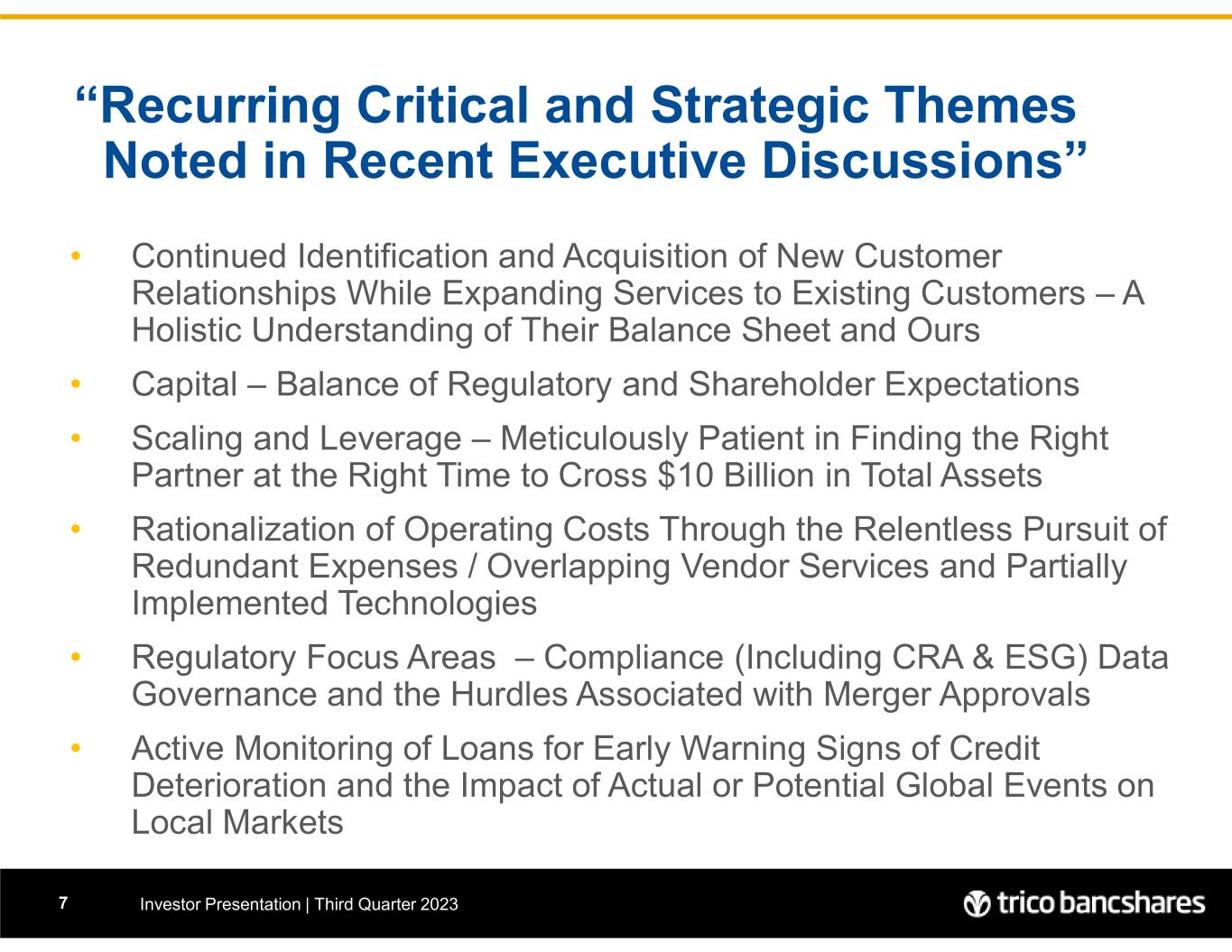 Company Overview Investor Presentation | Third Quarter 20236 Nasdaq: TCBK Headquarters: Chico, California Stock Price*: $32.03 Market Cap.: $1.07 Billion Asset Size: $9.90 Billion Loans: $6.71 Billion Deposits: $8.01 Billion Bank Branches: 69 ATMs: 87 Bank ATMs, with access to ~ 40,000 in network Market Area: TriCo currently serves 31 counties throughout California • As of close of business September 30, 2023
