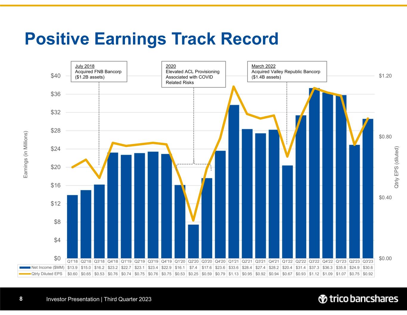 7 “Recurring Critical and Strategic Themes Noted in Recent Executive Discussions” • Continued Identification and Acquisition of New Customer Relationships While Expanding Services to Existing Customers – A Holistic Understanding of Their Balance Sheet and Ours • Capital – Balance of Regulatory and Shareholder Expectations • Scaling and Leverage – Meticulously Patient in Finding the Right Partner at the Right Time to Cross $10 Billion in Total Assets • Rationalization of Operating Costs Through the Relentless Pursuit of Redundant Expenses / Overlapping Vendor Services and Partially Implemented Technologies • Regulatory Focus Areas – Compliance (Including CRA & ESG) Data Governance and the Hurdles Associated with Merger Approvals • Active Monitoring of Loans for Early Warning Signs of Credit Deterioration and the Impact of Actual or Potential Global Events on Local Markets Investor Presentation | Third Quarter 2023