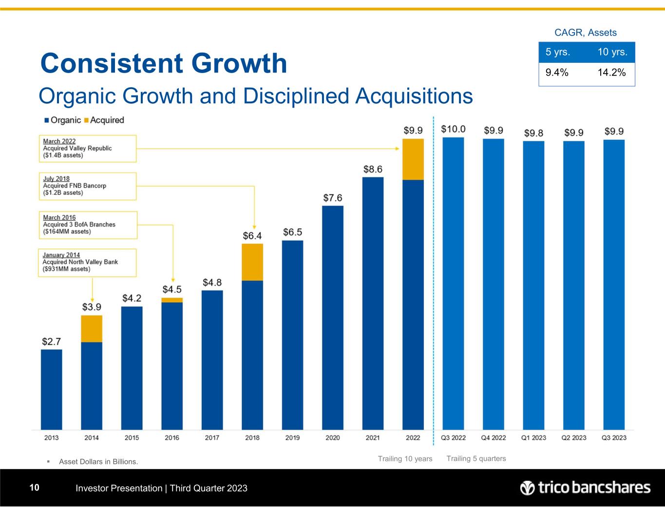 Consistent Growth Investor Presentation | Third Quarter 202310 Organic Growth and Disciplined Acquisitions  Asset Dollars in Billions. 10 yrs.5 yrs. 14.2%9.4% CAGR, Assets Trailing 10 years Trailing 5 quarters