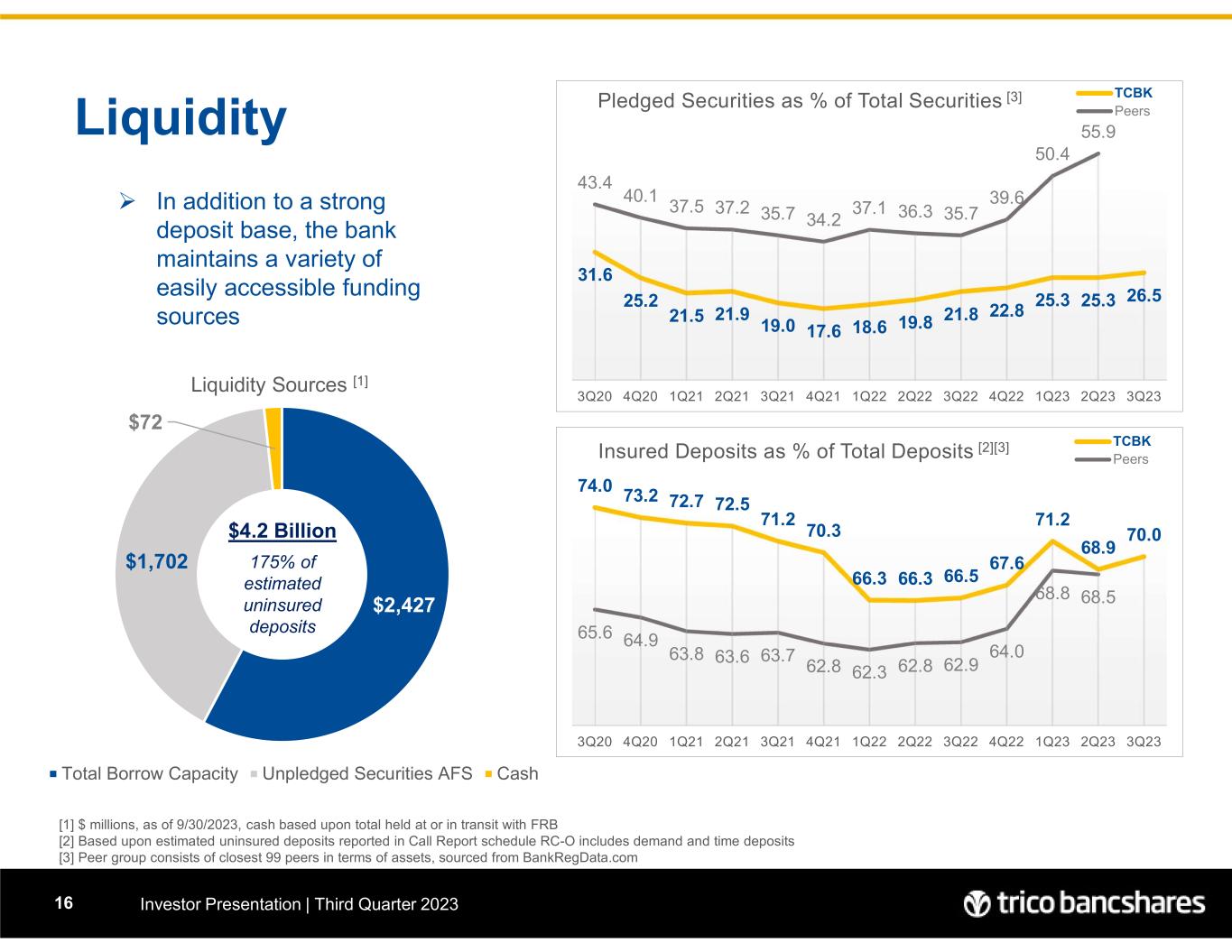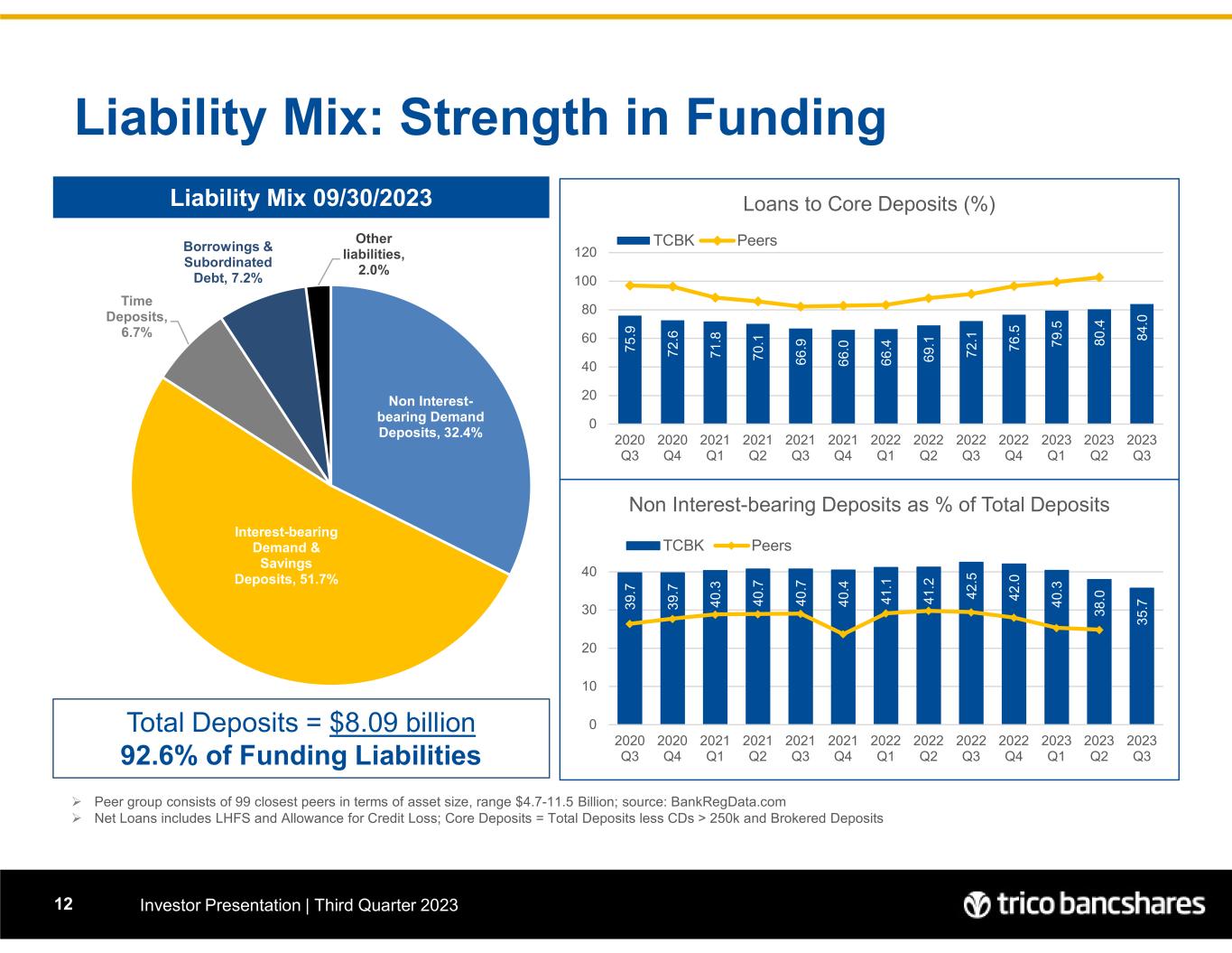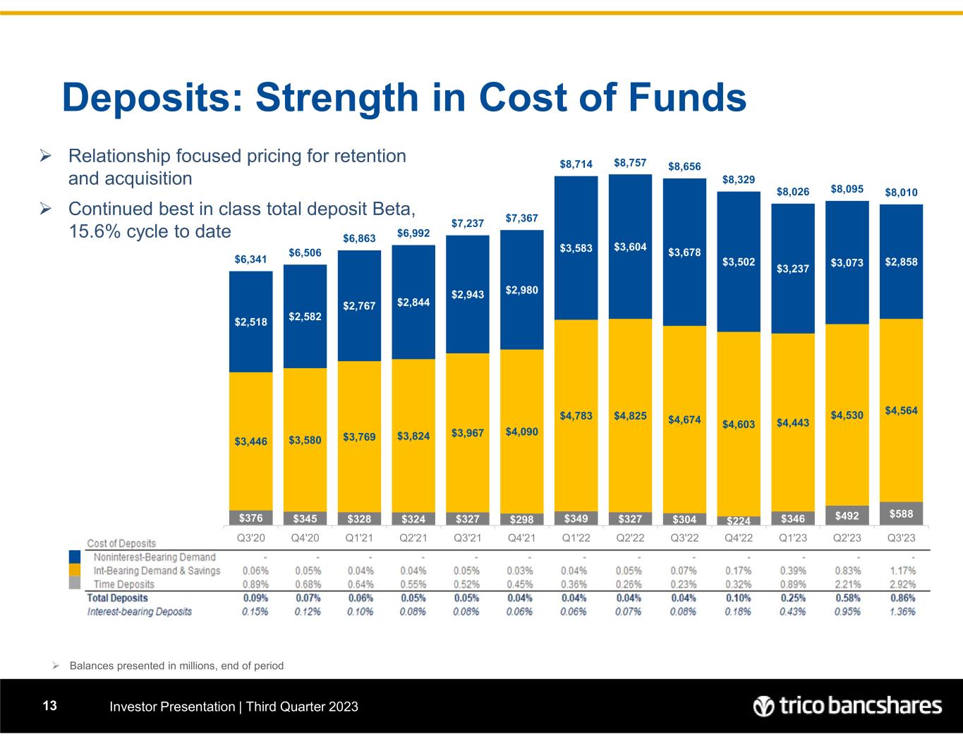 Liability Mix: Strength in Funding Investor Presentation | Third Quarter 202312 Total Deposits = $8.09 billion 92.6% of Funding Liabilities Liability Mix 09/30/2023  Peer group consists of 99 closest peers in terms of asset size, range $4.7-11.5 Billion; source: BankRegData.com  Net Loans includes LHFS and Allowance for Credit Loss; Core Deposits = Total Deposits less CDs > 250k and Brokered Deposits (0.03% Funding Cost) Non Interest- bearing Demand Deposits, 32.4% Interest-bearing Demand & Savings Deposits, 51.7% Time Deposits, 6.7% Borrowings & Subordinated Debt, 7.2% Other liabilities, 2.0% 7 5 .9 7 2 .6 7 1 .8 7 0 .1 6 6 .9 6 6 .0 6 6 .4 6 9 .1 7 2 .1 7 6 .5 7 9 .5 8 0 .4 8 4 .0 0 20 40 60 80 100 120 2020 Q3 2020 Q4 2021 Q1 2021 Q2 2021 Q3 2021 Q4 2022 Q1 2022 Q2 2022 Q3 2022 Q4 2023 Q1 2023 Q2 2023 Q3 Loans to Core Deposits (%) TCBK Peers 3 9 .7 3 9 .7 4 0 .3 4 0 .7 4 0 .7 4 0 .4 4 1 .1 4 1 .2 4 2 .5 4 2 .0 4 0 .3 3 8 .0 3 5 .7 0 10 20 30 40 2020 Q3 2020 Q4 2021 Q1 2021 Q2 2021 Q3 2021 Q4 2022 Q1 2022 Q2 2022 Q3 2022 Q4 2023 Q1 2023 Q2 2023 Q3 Non Interest-bearing Deposits as % of Total Deposits TCBK Peers