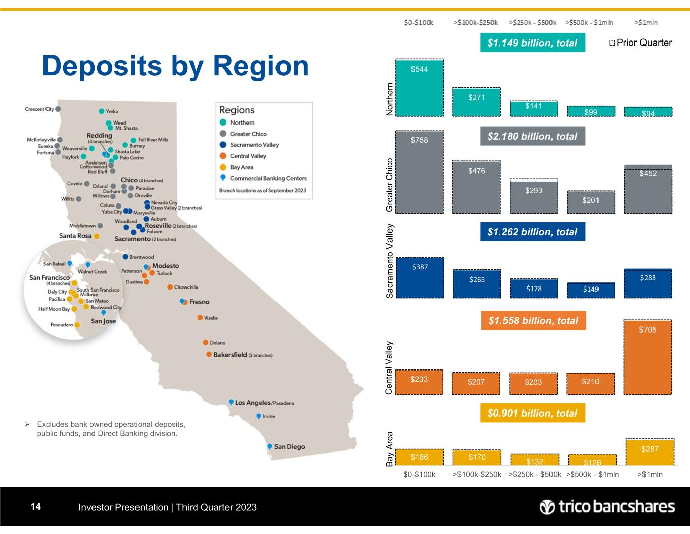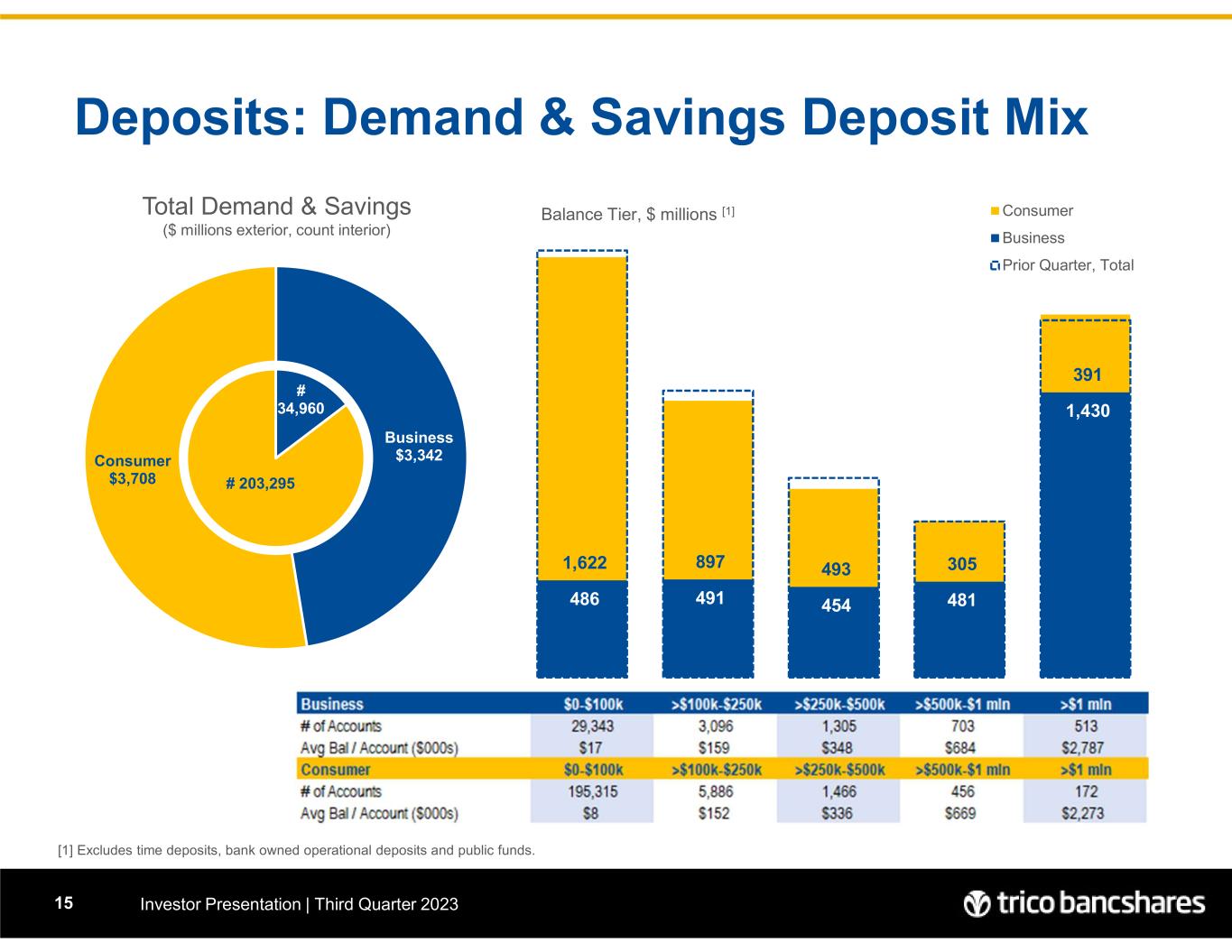 $186 $170 $132 $126 $287 - 100 200 300 400 500 600 700 800 $0-$100k >$100k-$250k >$250k - $500k >$500k - $1mln >$1mln $233 $207 $203 $210 $705 - 100 200 300 400 500 600 700 800 $387 $265 $178 $149 $283 - 100 200 300 400 500 600 700 800 $758 $476 $293 $201 $452 - 100 200 300 400 500 600 700 800 G re a te r C h ic o $544 $271 $141 $99 $94 - 100 200 300 400 500 600 700 800 Prior Quarter N o rt h er n Deposits by Region Investor Presentation | Third Quarter 202314  Excludes bank owned operational deposits, public funds, and Direct Banking division. $1.149 billion, total $2.180 billion, total $1.262 billion, total $1.558 billion, total $0.901 billion, total S a cr am en to V a lle y C e nt ra l V a lle y B a y A re a