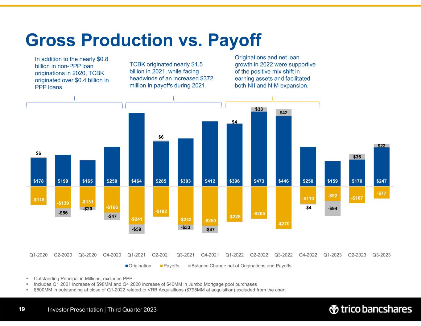 $178 $199 $165 $250 $464 $285 $303 $412 $396 $473 $446 $250 $159 $170 $247 -$118 -$139 -$131 -$166 -$241 -$192 -$243 -$250 -$225 -$205 -$270 -$110 -$92 -$107 -$77 $6 -$56 -$20 -$47 -$59 $6 -$33 -$47 $4 $33 $42 -$4 -$94 $36 $22 Q1-2020 Q2-2020 Q3-2020 Q4-2020 Q1-2021 Q2-2021 Q3-2021 Q4-2021 Q1-2022 Q2-2022 Q3-2022 Q4-2022 Q1-2023 Q2-2023 Q3-2023 Origination Payoffs Balance Change net of Originations and Payoffs Gross Production vs. Payoff Investor Presentation | Third Quarter 202319  Outstanding Principal in Millions, excludes PPP  Includes Q1 2021 increase of $98MM and Q4 2020 increase of $40MM in Jumbo Mortgage pool purchases  $800MM in outstanding at close of Q1-2022 related to VRB Acquisitions ($795MM at acquisition) excluded from the chart TCBK originated nearly $1.5 billion in 2021, while facing headwinds of an increased $372 million in payoffs during 2021. In addition to the nearly $0.8 billion in non-PPP loan originations in 2020, TCBK originated over $0.4 billion in PPP loans. Originations and net loan growth in 2022 were supportive of the positive mix shift in earning assets and facilitated both NII and NIM expansion.