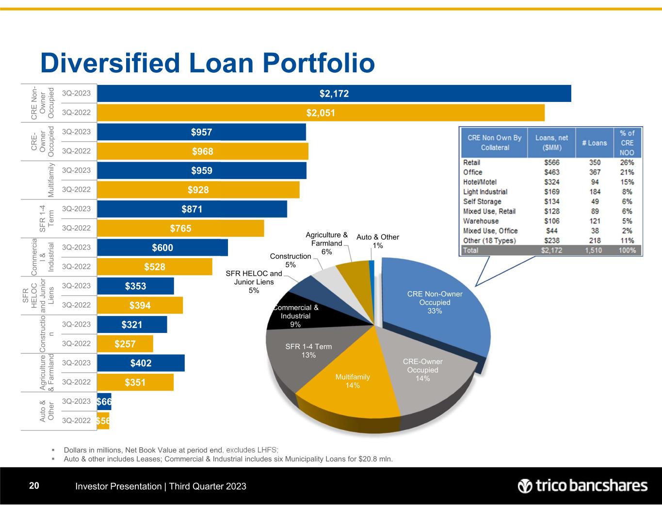 $2,172 $2,051 $957 $968 $959 $928 $871 $765 $600 $528 $353 $394 $321 $257 $402 $351 $66 $56 3Q-2023 3Q-2022 3Q-2023 3Q-2022 3Q-2023 3Q-2022 3Q-2023 3Q-2022 3Q-2023 3Q-2022 3Q-2023 3Q-2022 3Q-2023 3Q-2022 3Q-2023 3Q-2022 3Q-2023 3Q-2022 C R E N o n - O w n e r O cc u p ie d C R E - O w n e r O cc u p ie d M u lti fa m ily S F R 1 -4 T e rm C o m m e rc ia l & In d u st ri al S F R H E L O C a n d Ju n io r L ie n s C o n st ru ct io n A g ric u ltu re & F a rm la n d A u to & O th e r Diversified Loan Portfolio Investor Presentation | Third Quarter 202320  Dollars in millions, Net Book Value at period end, excludes LHFS;  Auto & other includes Leases; Commercial & Industrial includes six Municipality Loans for $20.8 mln. CRE Non-Owner Occupied 33% CRE-Owner Occupied 14%Multifamily 14% SFR 1-4 Term 13% Commercial & Industrial 9% SFR HELOC and Junior Liens 5% Construction 5% Agriculture & Farmland 6% Auto & Other 1%