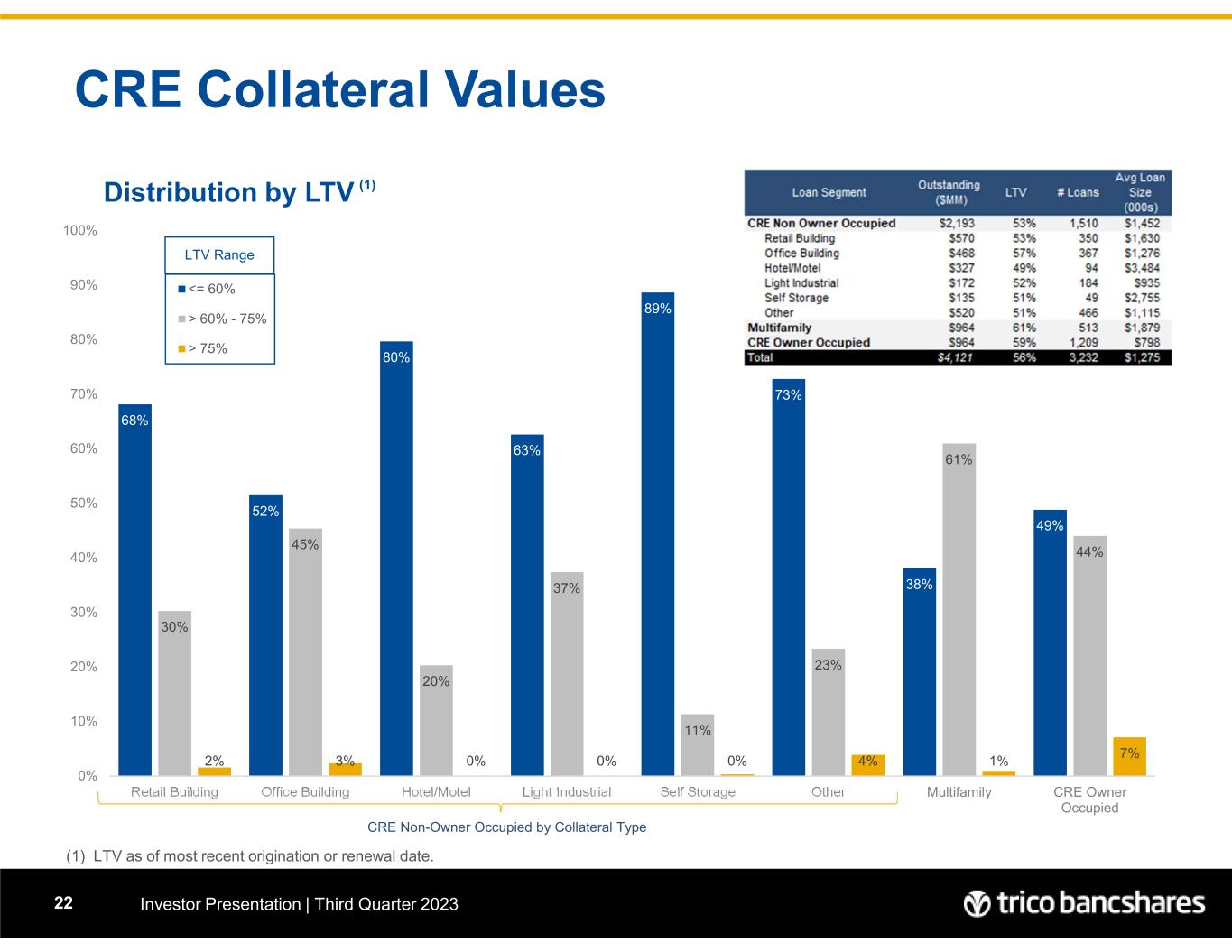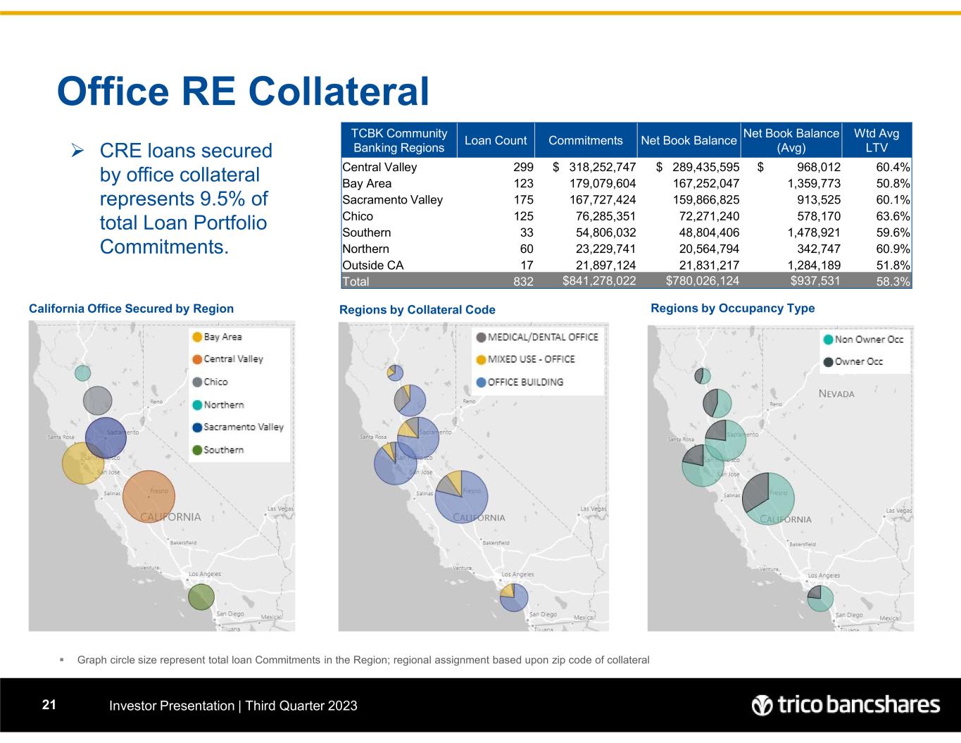 Office RE Collateral Investor Presentation | Third Quarter 202321  Graph circle size represent total loan Commitments in the Region; regional assignment based upon zip code of collateral  CRE loans secured by office collateral represents 9.5% of total Loan Portfolio Commitments. California Office Secured by Region Regions by Collateral Code Regions by Occupancy Type Wtd Avg LTV Net Book Balance (Avg) Net Book BalanceCommitmentsLoan Count TCBK Community Banking Regions 60.4%$ 968,012 $ 289,435,595 $ 318,252,747 299Central Valley 50.8%1,359,773 167,252,047 179,079,604 123Bay Area 60.1%913,525 159,866,825 167,727,424 175Sacramento Valley 63.6%578,170 72,271,240 76,285,351 125Chico 59.6%1,478,921 48,804,406 54,806,032 33Southern 60.9%342,747 20,564,794 23,229,741 60Northern 51.8%1,284,189 21,831,217 21,897,124 17Outside CA 58.3%$937,531 $780,026,124 $841,278,022 832Total