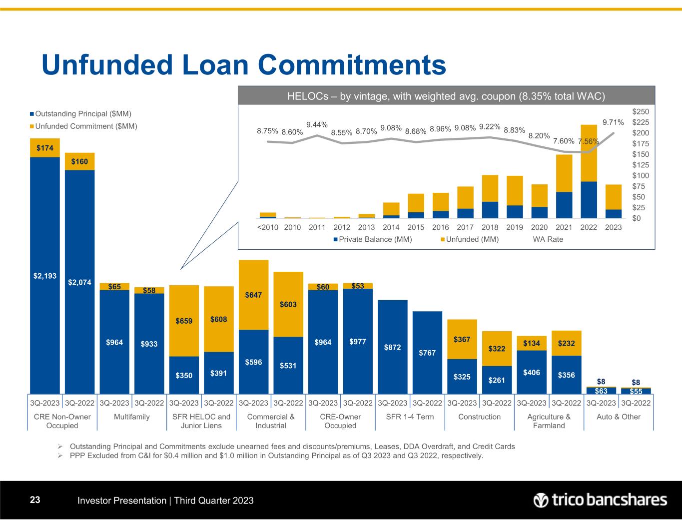 0.00% 2.00% 4.00% 6.00% 8.00% 10.00% 12.00% $0 $25 $50 $75 $100 $125 $150 $175 $200 $225 $250 20232022202120202019201820172016201520142013201220112010<2010 Private Balance (MM) Unfunded (MM) WA Rate $2,193 $2,074 $964 $933 $350 $391 $596 $531 $964 $977 $872 $767 $325 $261 $406 $356 $63 $55 $174 $160 $65 $58 $659 $608 $647 $603 $60 $53 $367 $322 $134 $232 $8 $8 3Q-2023 3Q-2022 3Q-2023 3Q-2022 3Q-2023 3Q-2022 3Q-2023 3Q-2022 3Q-2023 3Q-2022 3Q-2023 3Q-2022 3Q-2023 3Q-2022 3Q-2023 3Q-2022 3Q-2023 3Q-2022 CRE Non-Owner Occupied Multifamily SFR HELOC and Junior Liens Commercial & Industrial CRE-Owner Occupied SFR 1-4 Term Construction Agriculture & Farmland Auto & Other Outstanding Principal ($MM) Unfunded Commitment ($MM) Unfunded Loan Commitments Investor Presentation | Third Quarter 202323 HELOCs – by vintage, with weighted avg. coupon (8.35% total WAC)  Outstanding Principal and Commitments exclude unearned fees and discounts/premiums, Leases, DDA Overdraft, and Credit Cards  PPP Excluded from C&I for $0.4 million and $1.0 million in Outstanding Principal as of Q3 2023 and Q3 2022, respectively. 9.71% 7.56%7.60% 8.20% 8.83%9.22%9.08%8.96%8.68%9.08%8.70%8.55% 9.44% 8.60%8.75%
