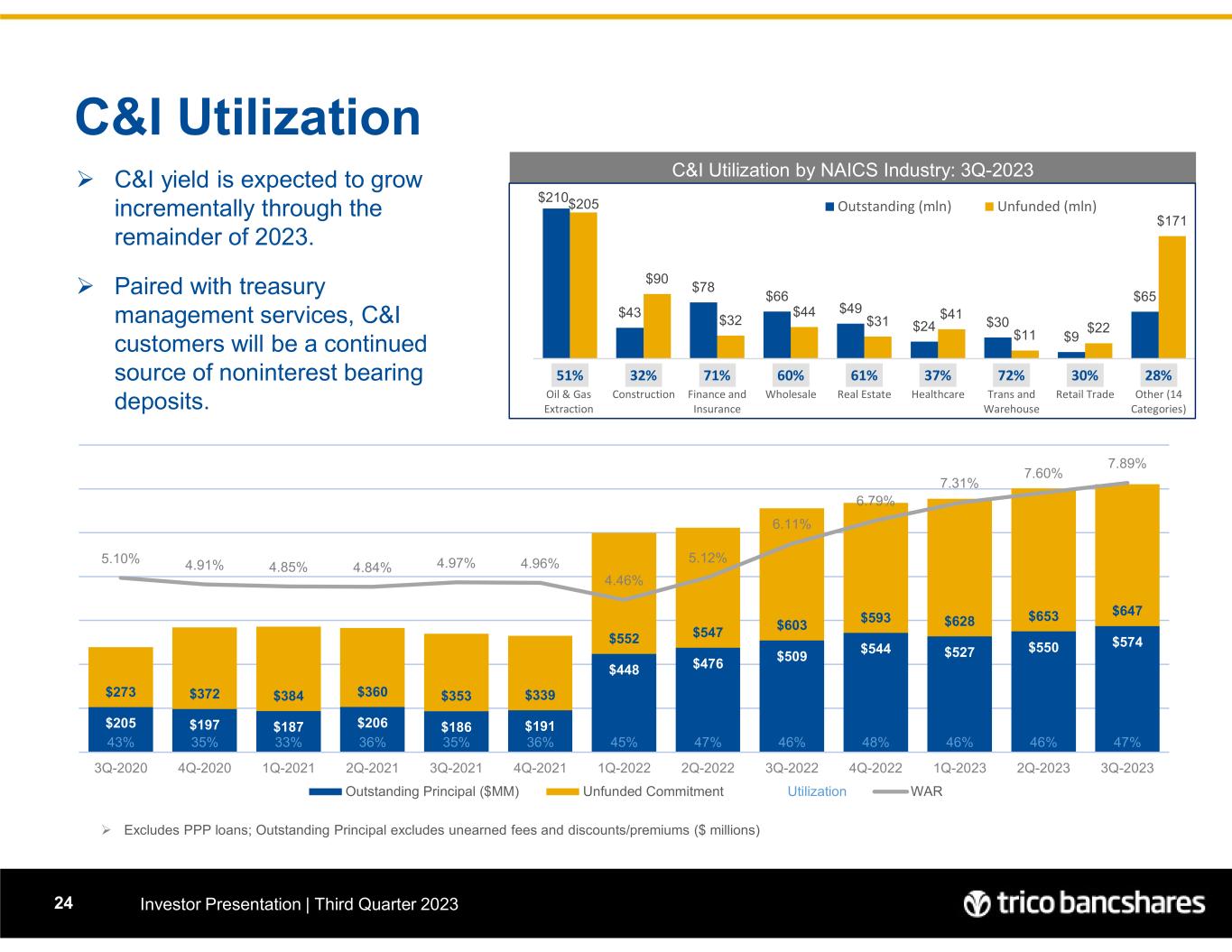 C&I Utilization Investor Presentation | Third Quarter 202324  Excludes PPP loans; Outstanding Principal excludes unearned fees and discounts/premiums ($ millions)  C&I yield is expected to grow incrementally through the remainder of 2023.  Paired with treasury management services, C&I customers will be a continued source of noninterest bearing deposits. C&I Utilization by NAICS Industry: 3Q-2023 $205 $197 $187 $206 $186 $191 $448 $476 $509 $544 $527 $550 $574 $273 $372 $384 $360 $353 $339 $552 $547 $603 $593 $628 $653 $647 43% 35% 33% 36% 35% 36% 45% 47% 46% 48% 46% 46% 47% 5.10% 4.91% 4.85% 4.84% 4.97% 4.96% 4.46% 5.12% 6.11% 6.79% 7.31% 7.60% 7.89% 0% 1% 2% 3% 4% 5% 6% 7% 8% 9% $0 $200 $400 $600 $800 $1,000 $1,200 $1,400 3Q-2020 4Q-2020 1Q-2021 2Q-2021 3Q-2021 4Q-2021 1Q-2022 2Q-2022 3Q-2022 4Q-2022 1Q-2023 2Q-2023 3Q-2023 Outstanding Principal ($MM) Unfunded Commitment Utilization WAR $210 $43 $78 $66 $49 $24 $30 $9 $65 $205 $90 $32 $44 $31 $41 $11 $22 $171 51% 32% 71% 60% 61% 37% 72% 30% 28% 0% 5000% 10000% 15000% 20000% Oil & Gas Extraction Construction Finance and Insurance Wholesale Real Estate Healthcare Trans and Warehouse Retail Trade Other (14 Categories) Outstanding (mln) Unfunded (mln)