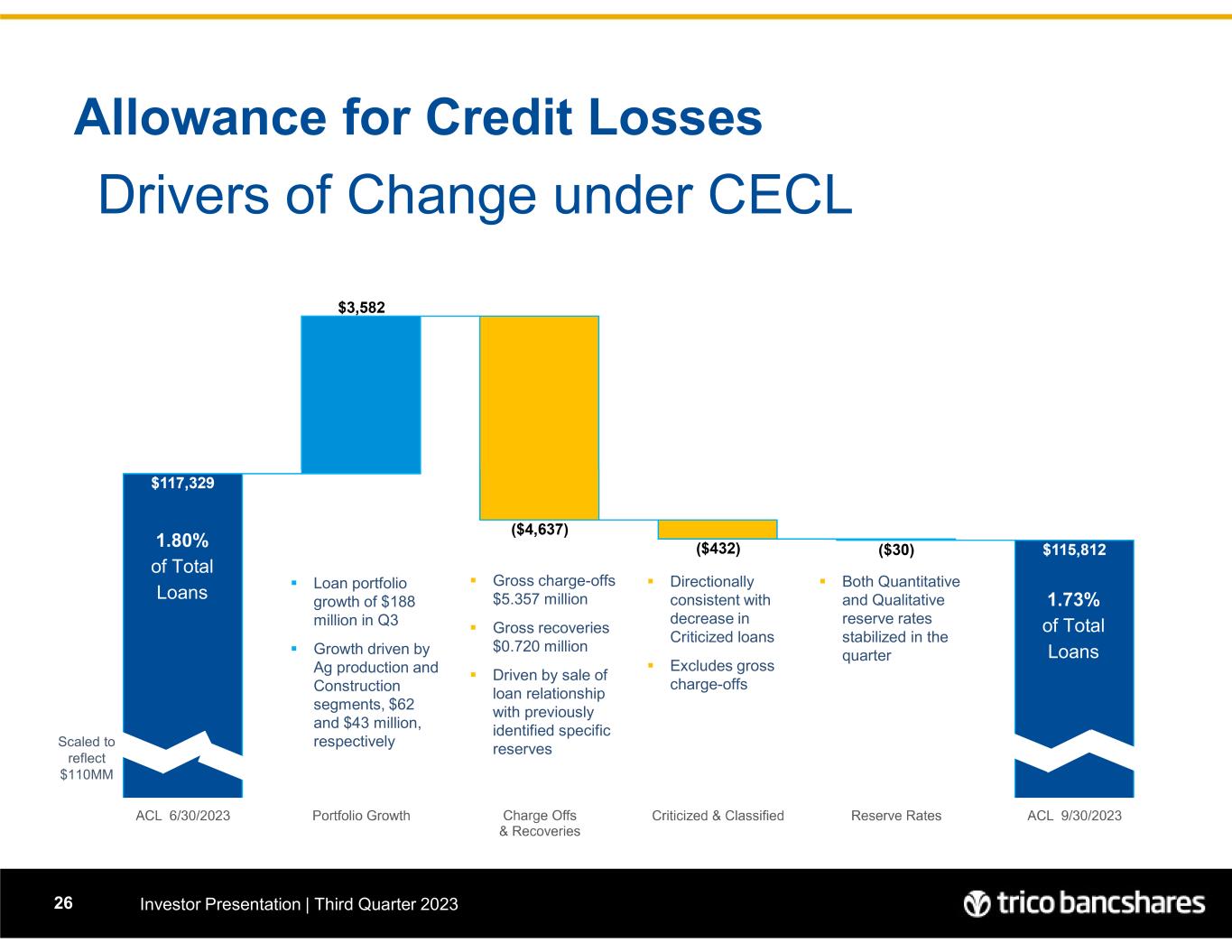 Allowance for Credit Losses Investor Presentation | Third Quarter 202326 Drivers of Change under CECL  Loan portfolio growth of $188 million in Q3  Growth driven by Ag production and Construction segments, $62 and $43 million, respectively  Both Quantitative and Qualitative reserve rates stabilized in the quarter  Gross charge-offs $5.357 million  Gross recoveries $0.720 million  Driven by sale of loan relationship with previously identified specific reserves 1.80% of Total Loans 1.73% of Total Loans  Directionally consistent with decrease in Criticized loans  Excludes gross charge-offs Scaled to reflect $110MM