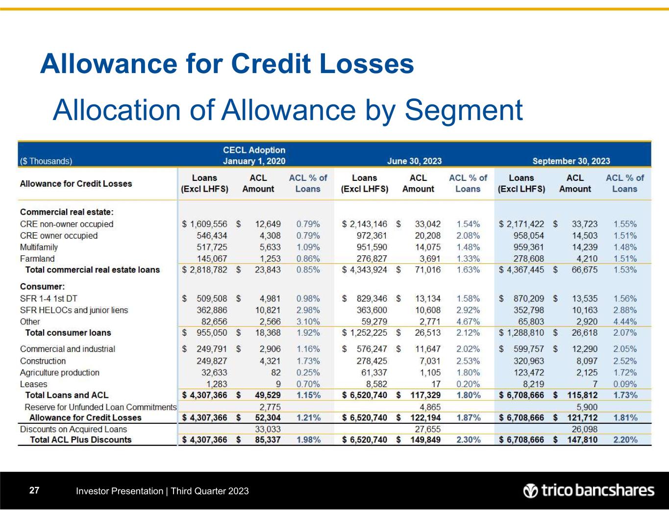 Allowance for Credit Losses Investor Presentation | Third Quarter 202327 Allocation of Allowance by Segment