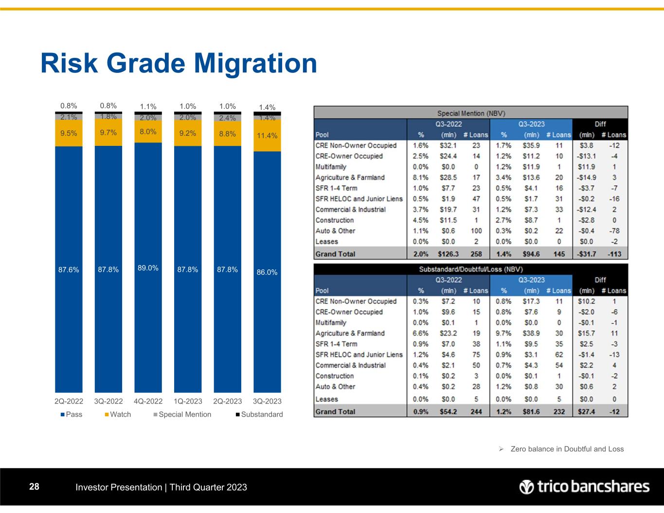 Risk Grade Migration Investor Presentation | Third Quarter 202328  Zero balance in Doubtful and Loss 86.0%87.8%87.8%89.0%87.8%87.6% 11.4%8.8%9.2%8.0%9.7%9.5% 1.4%2.4%2.0%2.0%1.8%2.1% 1.4%1.0%1.0%1.1%0.8%0.8% 3Q-20232Q-20231Q-20234Q-20223Q-20222Q-2022 Pass Watch Special Mention Substandard