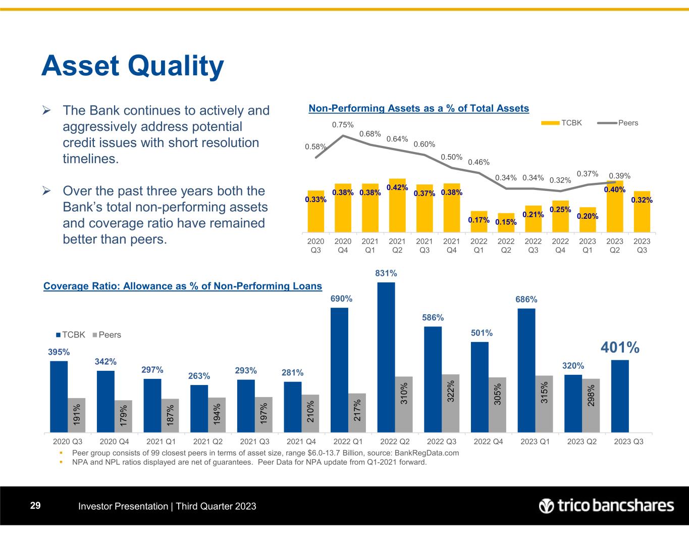 395% 342% 297% 263% 293% 281% 690% 831% 586% 501% 686% 320% 401% 19 1% 17 9% 18 7% 19 4% 19 7% 21 0% 21 7% 31 0% 32 2% 30 5% 31 5% 29 8% 2020 Q3 2020 Q4 2021 Q1 2021 Q2 2021 Q3 2021 Q4 2022 Q1 2022 Q2 2022 Q3 2022 Q4 2023 Q1 2023 Q2 2023 Q3 TCBK Peers Asset Quality Investor Presentation | Third Quarter 202329  Peer group consists of 99 closest peers in terms of asset size, range $6.0-13.7 Billion, source: BankRegData.com  NPA and NPL ratios displayed are net of guarantees. Peer Data for NPA update from Q1-2021 forward. Coverage Ratio: Allowance as % of Non-Performing Loans  The Bank continues to actively and aggressively address potential credit issues with short resolution timelines.  Over the past three years both the Bank’s total non-performing assets and coverage ratio have remained better than peers. Non-Performing Assets as a % of Total Assets 0.33% 0.38% 0.38% 0.42% 0.37% 0.38% 0.17% 0.15% 0.21% 0.25% 0.20% 0.40% 0.32% 0.58% 0.75% 0.68% 0.64% 0.60% 0.50% 0.46% 0.34% 0.34% 0.32% 0.37% 0.39% 2020 Q3 2020 Q4 2021 Q1 2021 Q2 2021 Q3 2021 Q4 2022 Q1 2022 Q2 2022 Q3 2022 Q4 2023 Q1 2023 Q2 2023 Q3 TCBK Peers