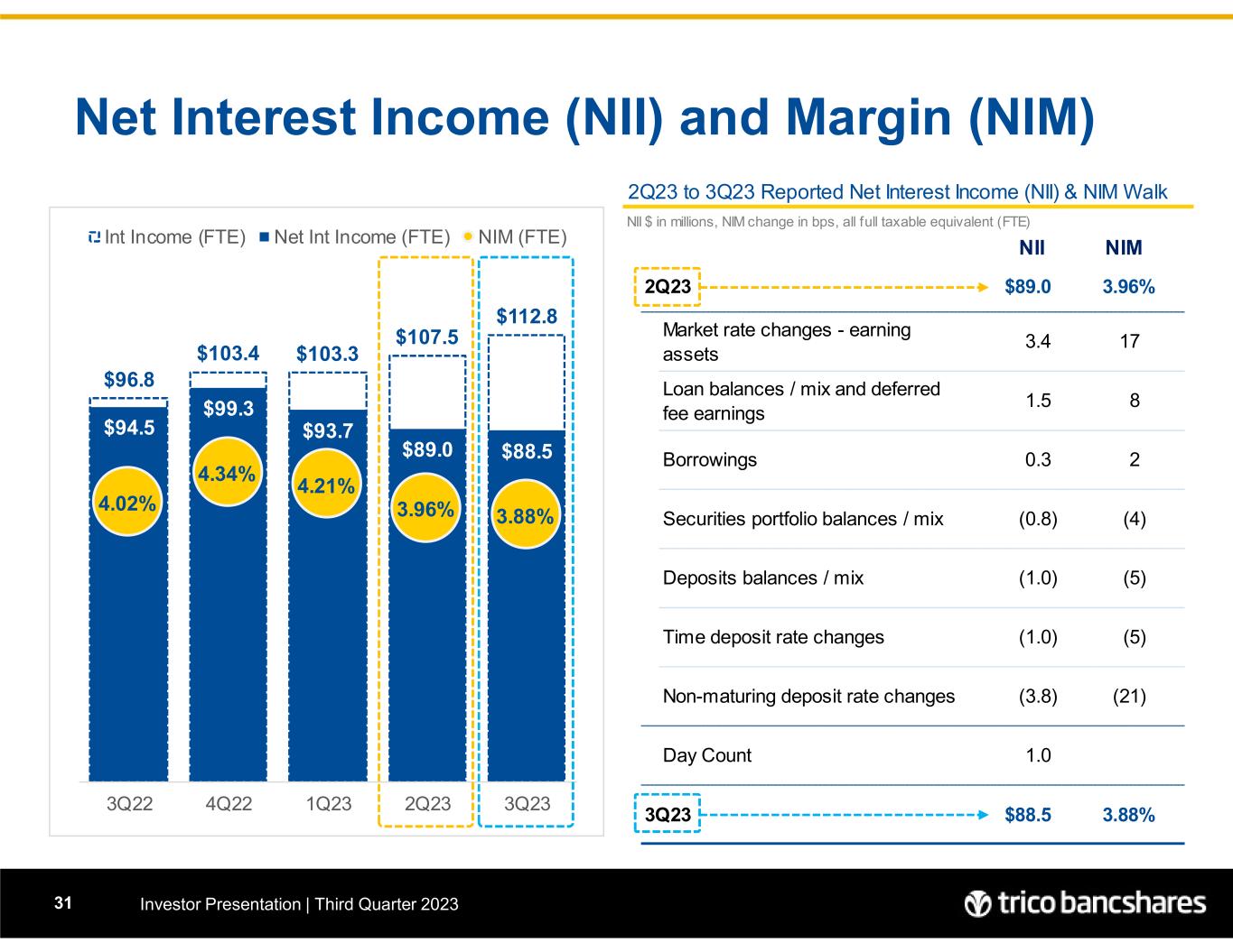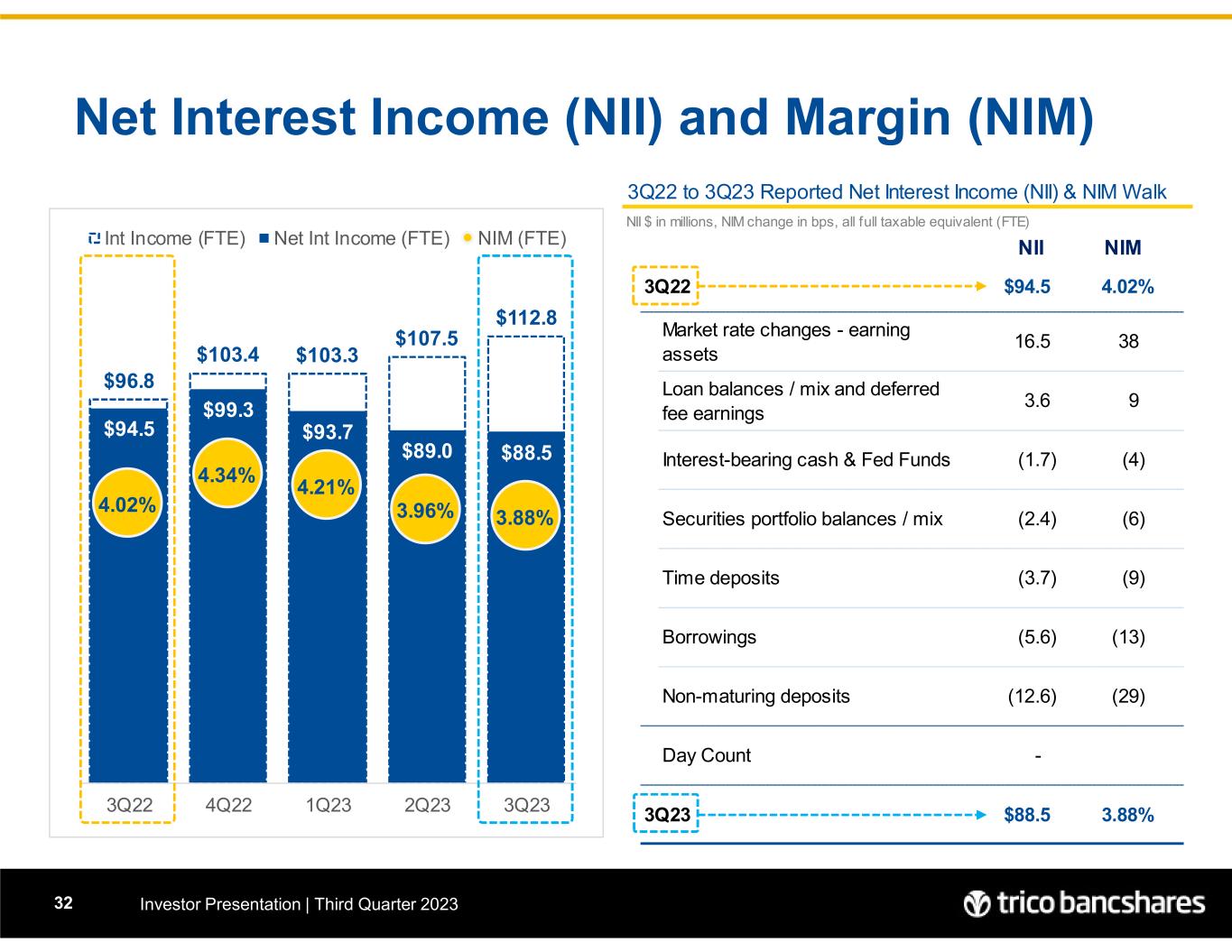 3Q22 to 3Q23 Reported Net Interest Income (NII) & NIM Walk NII $ in millions, NIM change in bps, all full taxable equivalent (FTE) NII NIM 3Q22 $94.5 4.02% Market rate changes - earning assets 16.5 38 Loan balances / mix and deferred fee earnings 3.6 9 Interest-bearing cash & Fed Funds (1.7) (4) Securities portfolio balances / mix (2.4) (6) Time deposits (3.7) (9) Borrowings (5.6) (13) Non-maturing deposits (12.6) (29) Day Count - 3Q23 $88.5 3.88% $96.8 $103.4 $103.3 $107.5 $112.8 $94.5 $99.3 $93.7 $89.0 $88.5 4.02% 4.34% 4.21% 3.96% 3.88% 1.00% 2.00% 3.00% 4.00% 5.00% 6.00% 7.00% - 20.0 40.0 60.0 80.0 100.0 120.0 140.0 3Q22 4Q22 1Q23 2Q23 3Q23 Int Income (FTE) Net Int Income (FTE) NIM (FTE) Net Interest Income (NII) and Margin (NIM) Investor Presentation | Third Quarter 202332