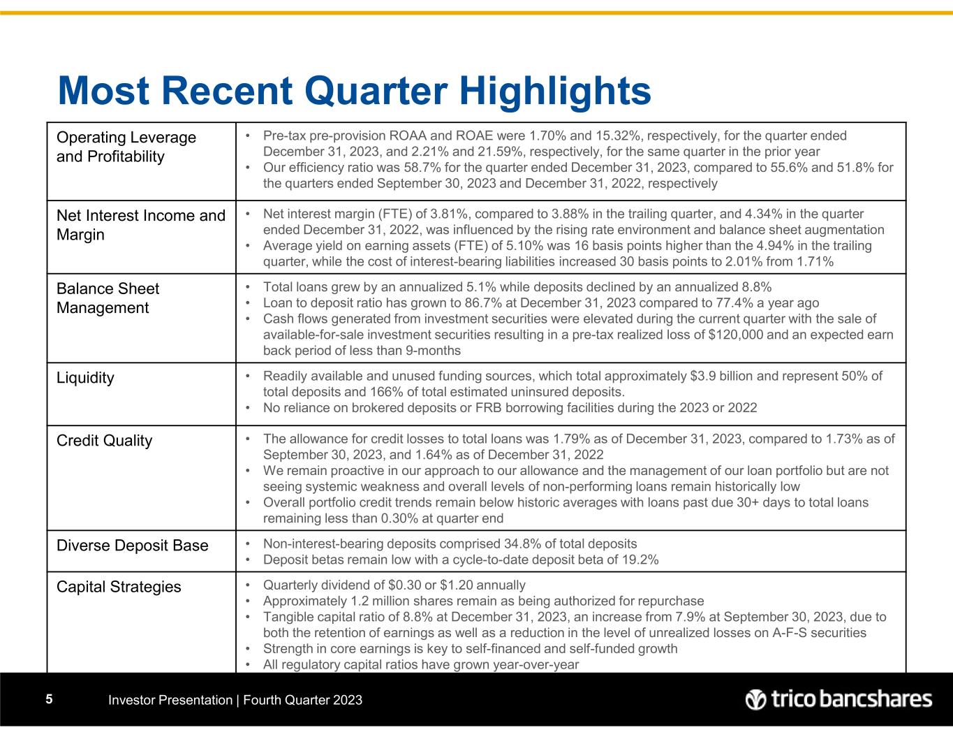 Agenda • Most Recent Quarter Recap • Company Overview • Lending Overview • Deposit Overview • Financials 4 • Judi Giem, SVP & Chief Human Resources Officer • Peter Wiese, EVP & Chief Financial Officer • Dan Bailey, EVP & Chief Banking Officer • Rick Smith, President & Chief Executive Officer • John Fleshood, EVP & Chief Operating Officer • Craig Carney, EVP & Chief Credit Officer • Greg Gehlmann, SVP & General Counsel Executive Team (left to right) 4 Investor Presentation | Fourth Quarter 2023