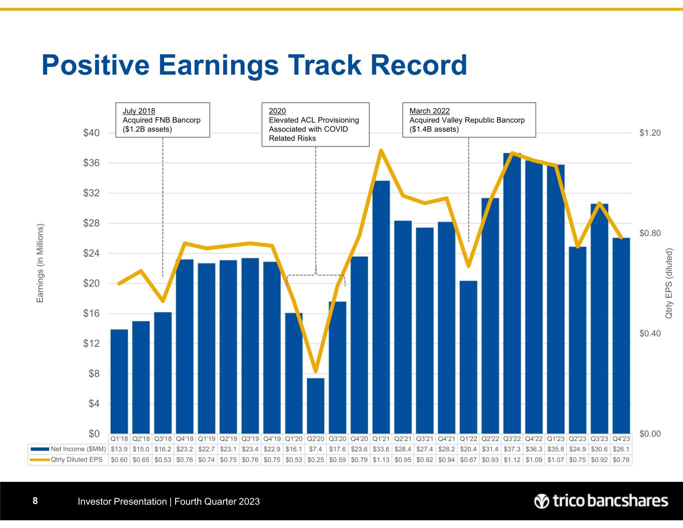7 “Recurring Critical and Strategic Themes Noted in Recent Executive Discussions” • Continued Identification and Acquisition of New Customer Relationships While Expanding Services to Existing Customers – A Holistic Understanding of Their Balance Sheet and Ours • Capital – Balance of Regulatory and Shareholder Expectations • Scaling and Leverage – Meticulously Patient in Finding the Right Partner at the Right Time to Cross $10 Billion in Total Assets • Rationalization of Operating Costs Through the Relentless Pursuit of Redundant Expenses / Overlapping Vendor Services and Partially Implemented Technologies • Regulatory Focus Areas – Compliance (Including CRA & ESG) Data Governance and the Hurdles Associated with Merger Approvals • Active Monitoring of Loans for Early Warning Signs of Credit Deterioration and the Impact of Actual or Potential Global Events on Local Markets Investor Presentation | Fourth Quarter 2023