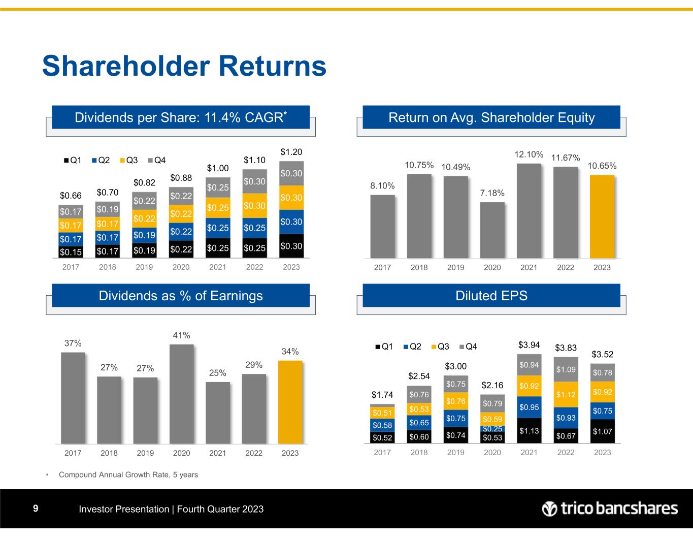 Q1'18 Q2'18 Q3'18 Q4'18 Q1'19 Q2'19 Q3'19 Q4'19 Q1'20 Q2'20 Q3'20 Q4'20 Q1'21 Q2'21 Q3'21 Q4'21 Q1'22 Q2'22 Q3'22 Q4'22 Q1'23 Q2'23 Q3'23 Q4'23 Net Income ($MM) $13.9 $15.0 $16.2 $23.2 $22.7 $23.1 $23.4 $22.9 $16.1 $7.4 $17.6 $23.6 $33.6 $28.4 $27.4 $28.2 $20.4 $31.4 $37.3 $36.3 $35.8 $24.9 $30.6 $26.1 Qtrly Diluted EPS $0.60 $0.65 $0.53 $0.76 $0.74 $0.75 $0.76 $0.75 $0.53 $0.25 $0.59 $0.79 $1.13 $0.95 $0.92 $0.94 $0.67 $0.93 $1.12 $1.09 $1.07 $0.75 $0.92 $0.78 $0.00 $0.40 $0.80 $1.20 $0 $4 $8 $12 $16 $20 $24 $28 $32 $36 $40 Q tr ly E P S ( di lu te d) E a rn in gs ( in M ill io n s) Positive Earnings Track Record Investor Presentation | Fourth Quarter 20238 July 2018 Acquired FNB Bancorp ($1.2B assets) March 2022 Acquired Valley Republic Bancorp ($1.4B assets) 2020 Elevated ACL Provisioning Associated with COVID Related Risks