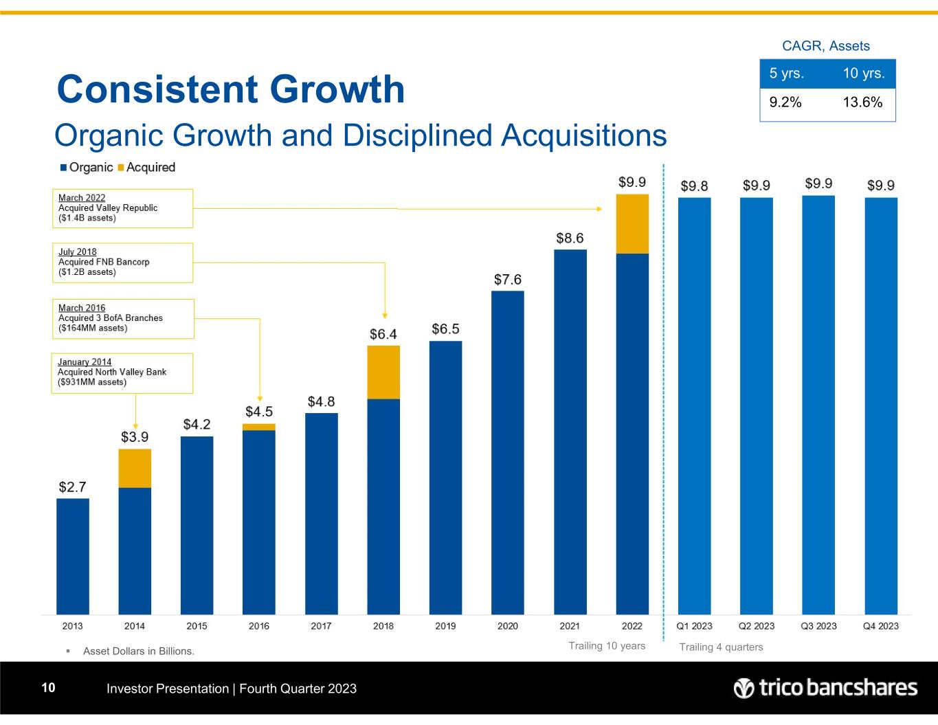 Consistent Growth Investor Presentation | Fourth Quarter 202310 Organic Growth and Disciplined Acquisitions  Asset Dollars in Billions. 10 yrs.5 yrs. 13.6%9.2% CAGR, Assets Trailing 10 years Trailing 4 quarters